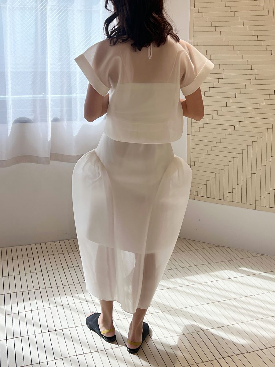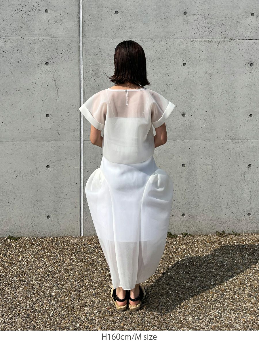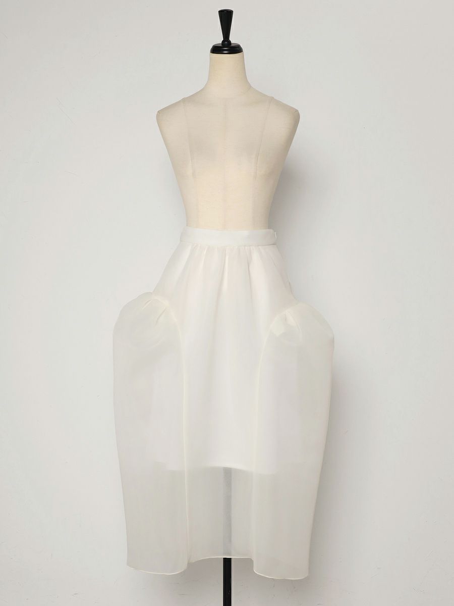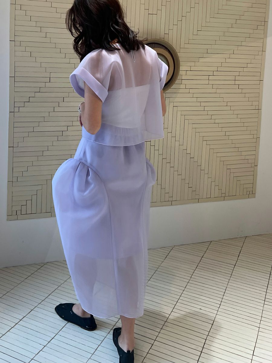 シアー感のある軽くてハリ感が特徴的なダブルラッセル素材を使用したボリュームシルエットが印象的なスカート。