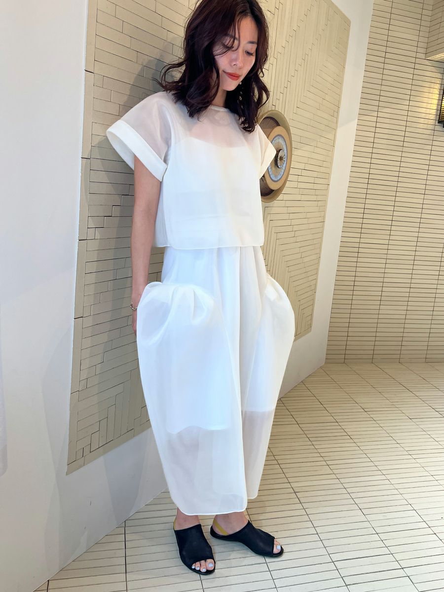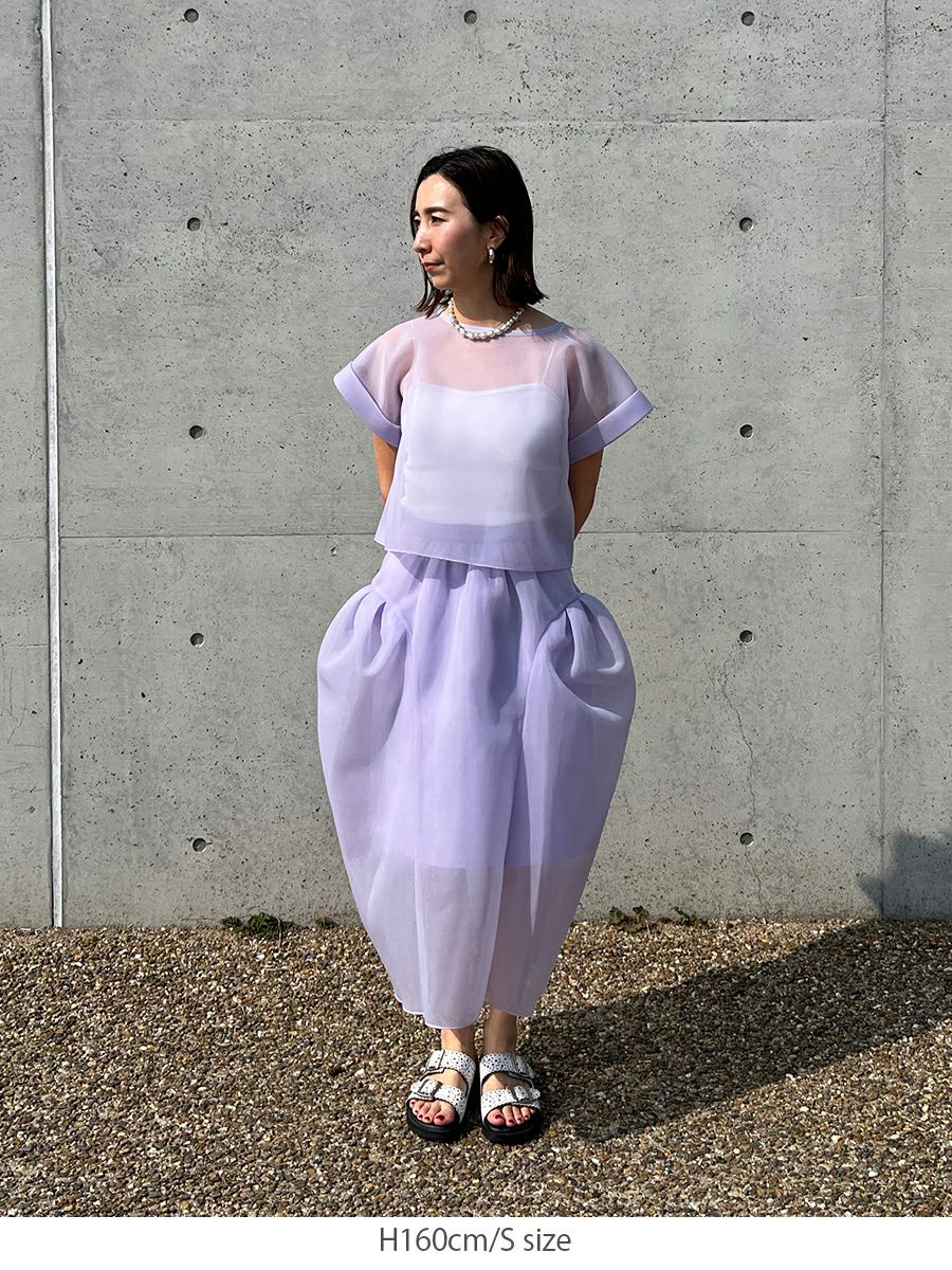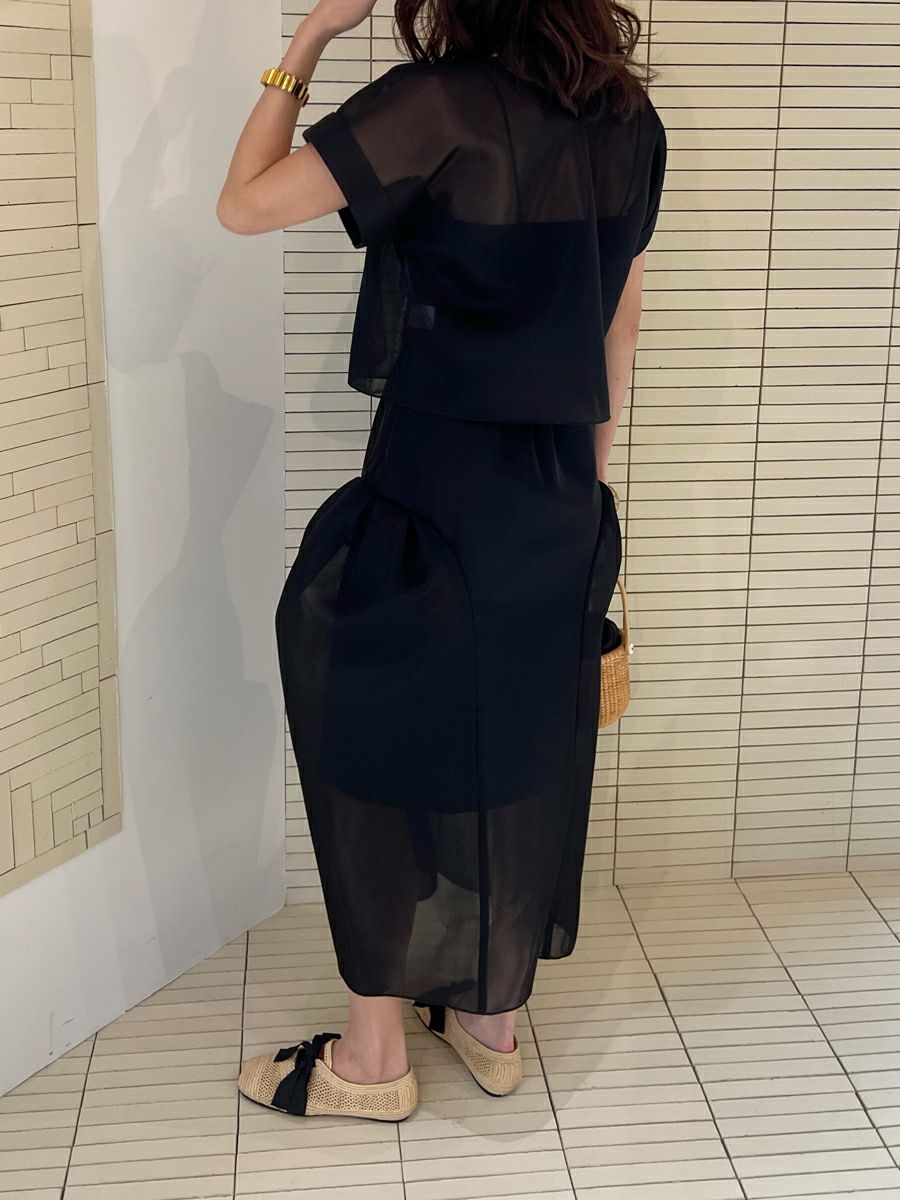 また同素材のSHEER TOPS ともバランスよく着こなせ、セットアップスタイルを楽しめます。