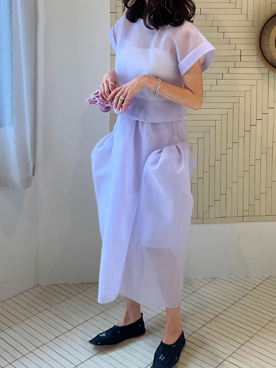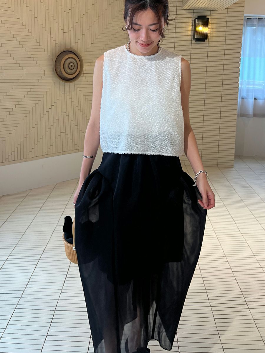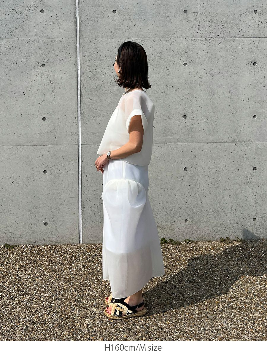 また同素材のSHEER TOPS ともバランスよく着こなせ、セットアップスタイルを楽しめます。