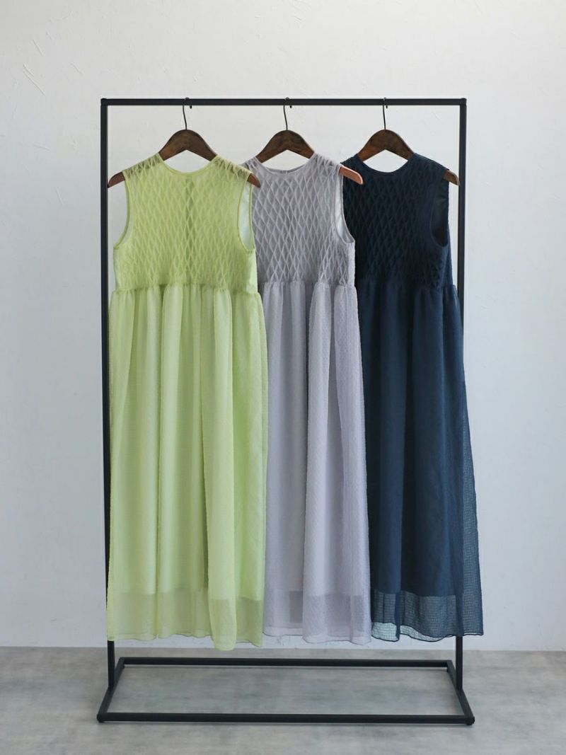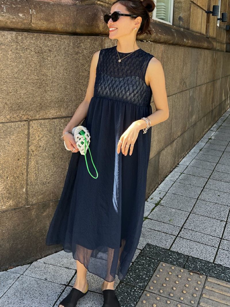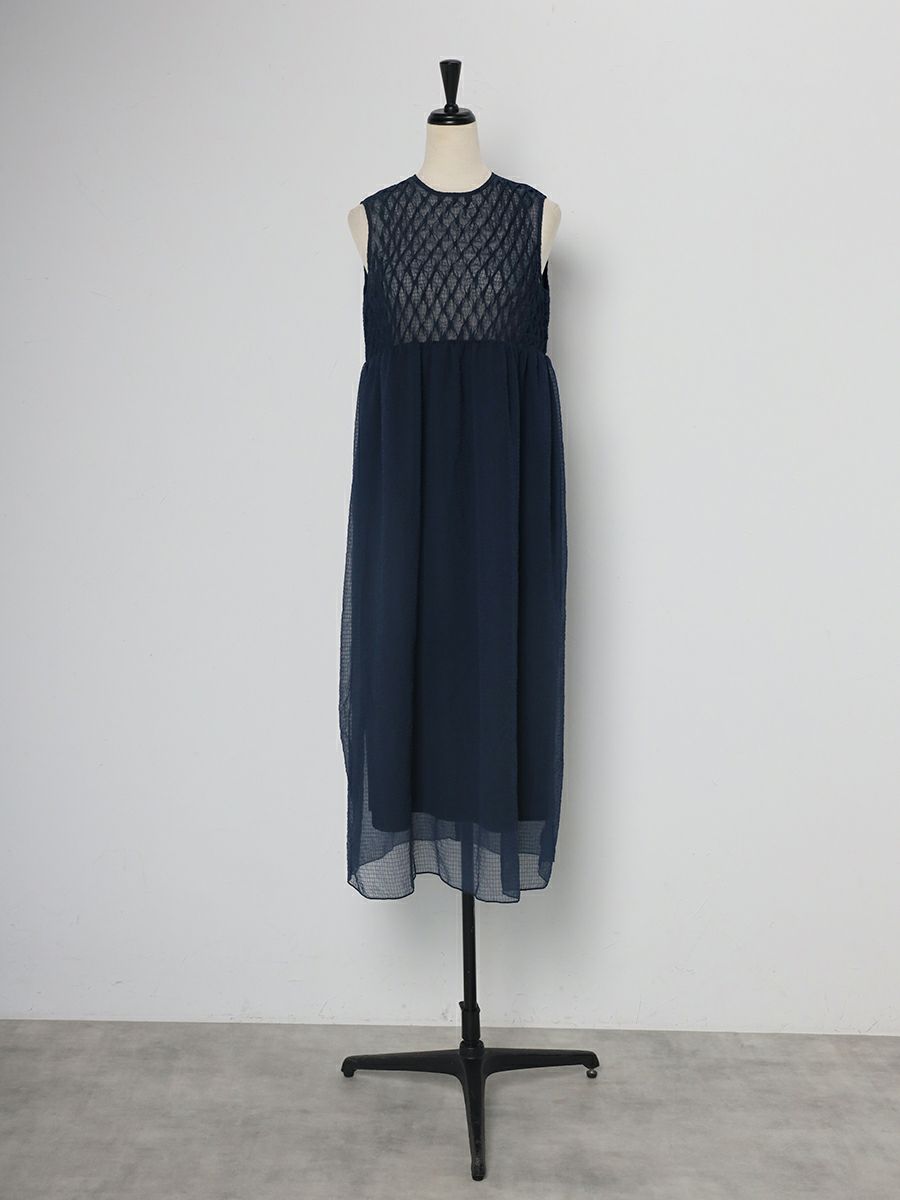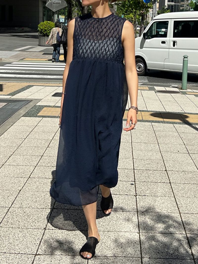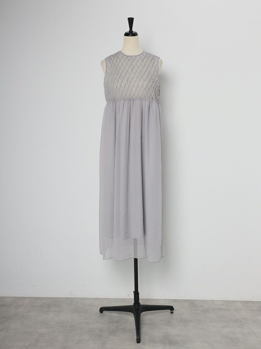 透明感のある素材で胸元にシャーリングをふんだんに施したワンピース。