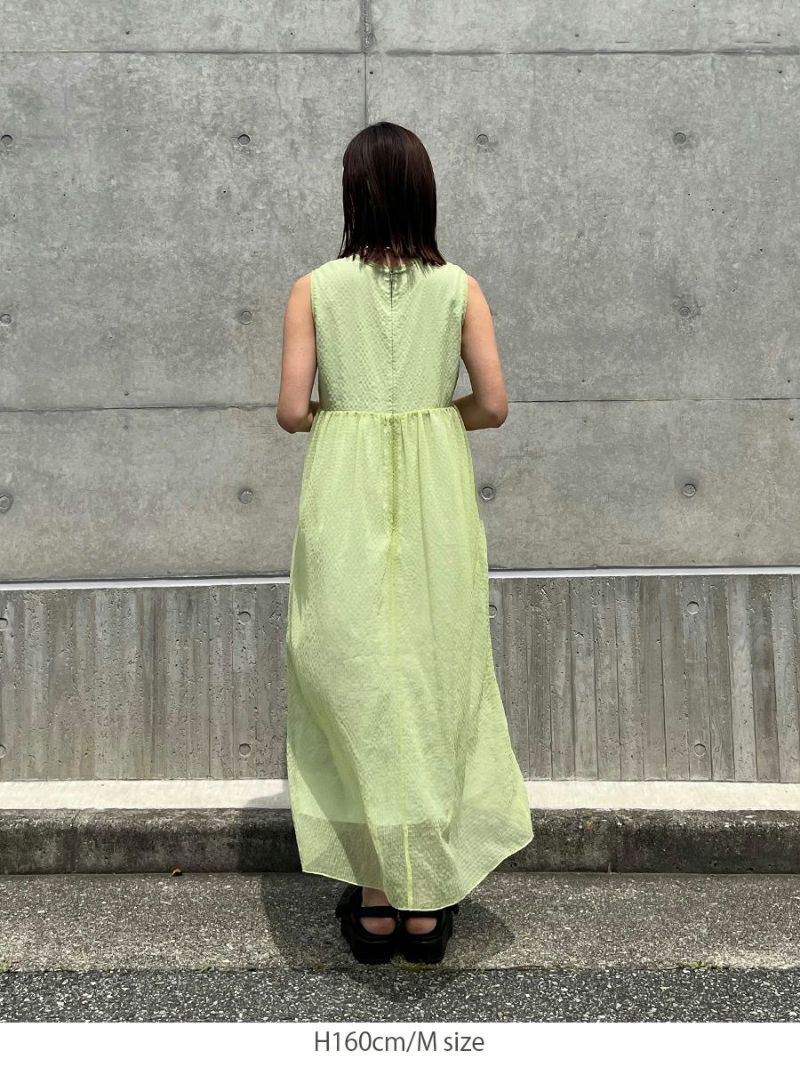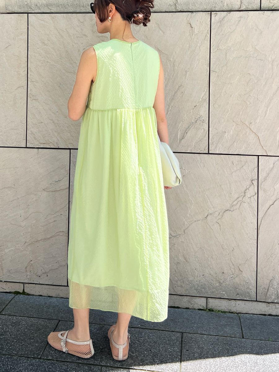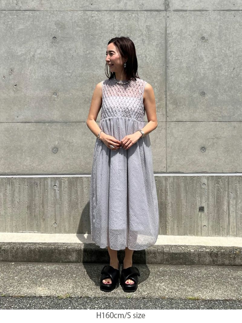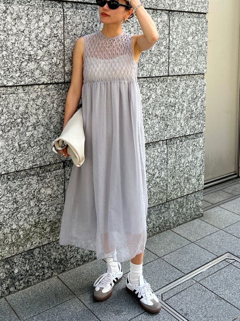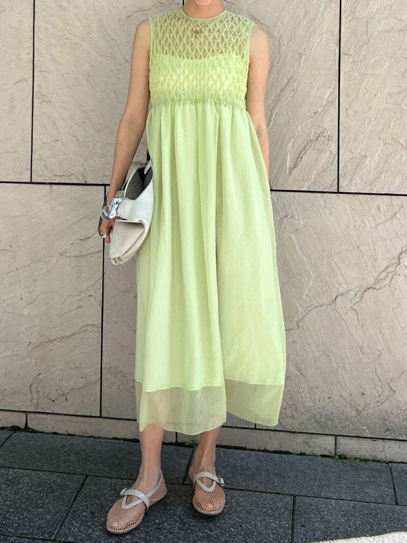 透明感のある素材で胸元にシャーリングをふんだんに施したワンピース。
