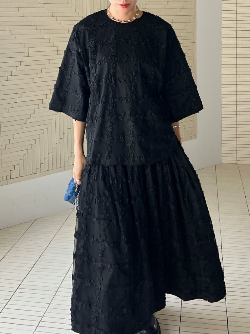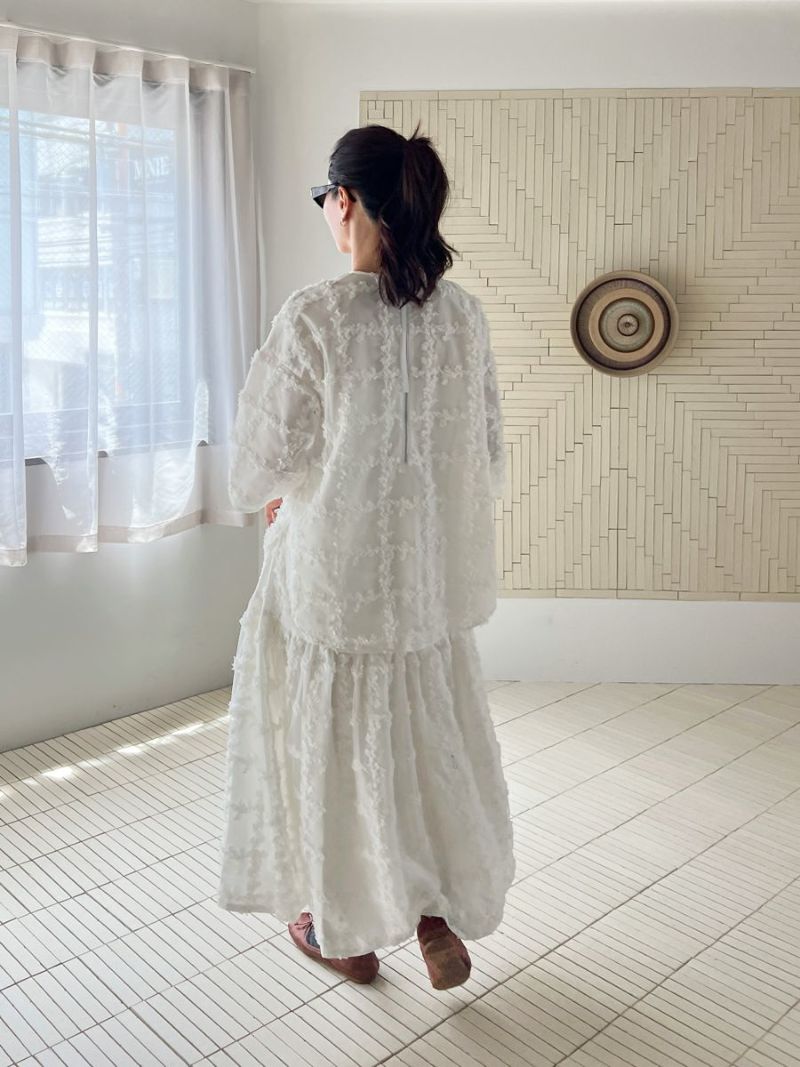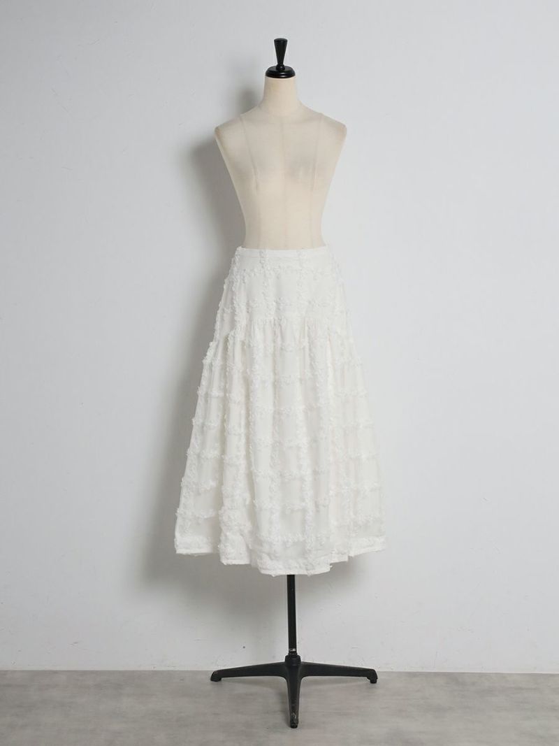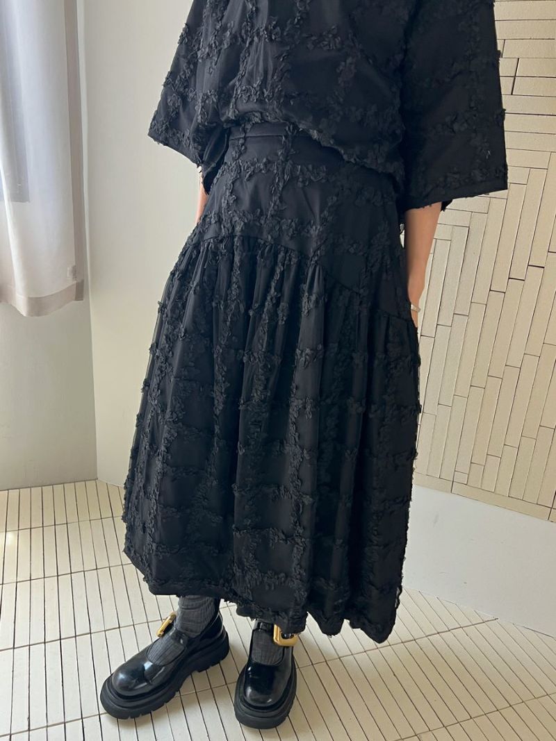 立体的に何層にも花びらが重なり合ったように表現された格子柄が美しく映えるスカート。