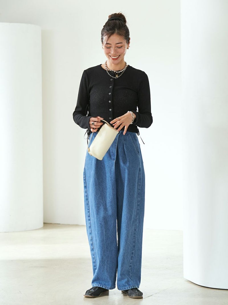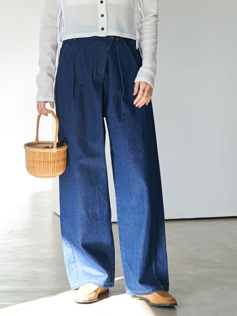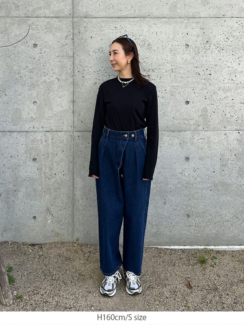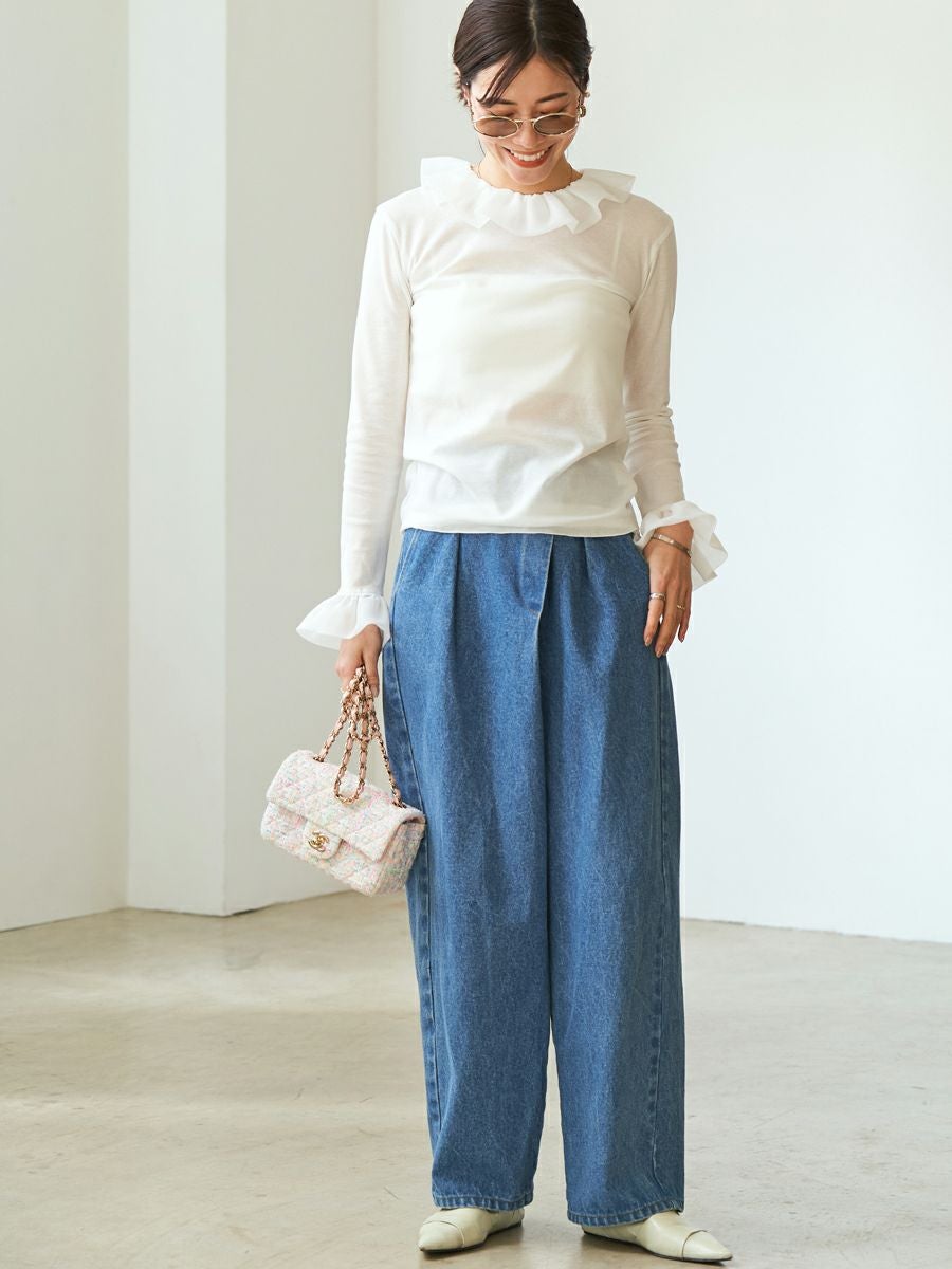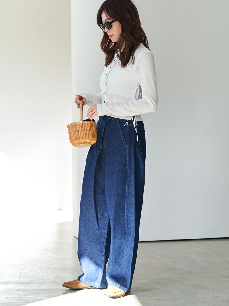 デニムパンツにタックデザインとラップ調のウエストをプラスすることで腰回りのラインをカバーしつつ、シンプルなトップスとのコーディネートも様になるバランスに仕上げました。