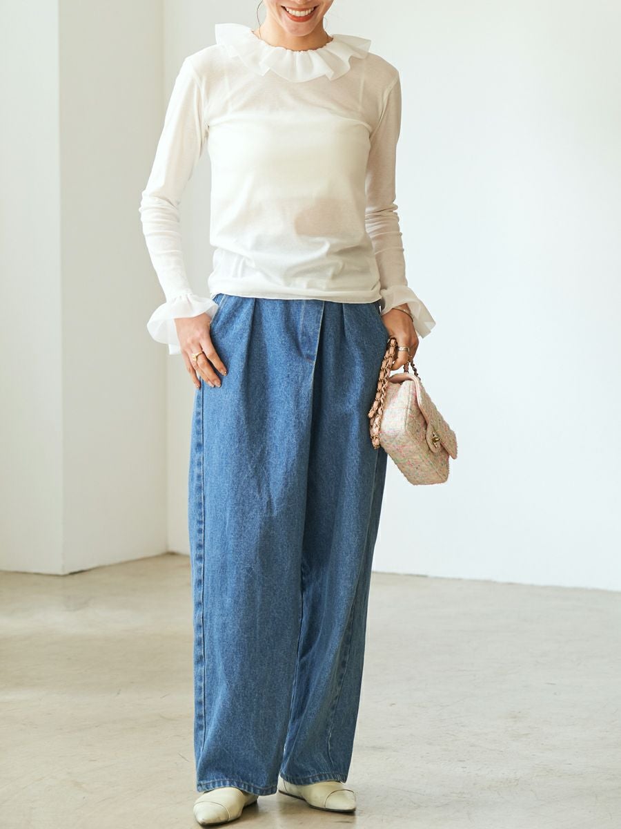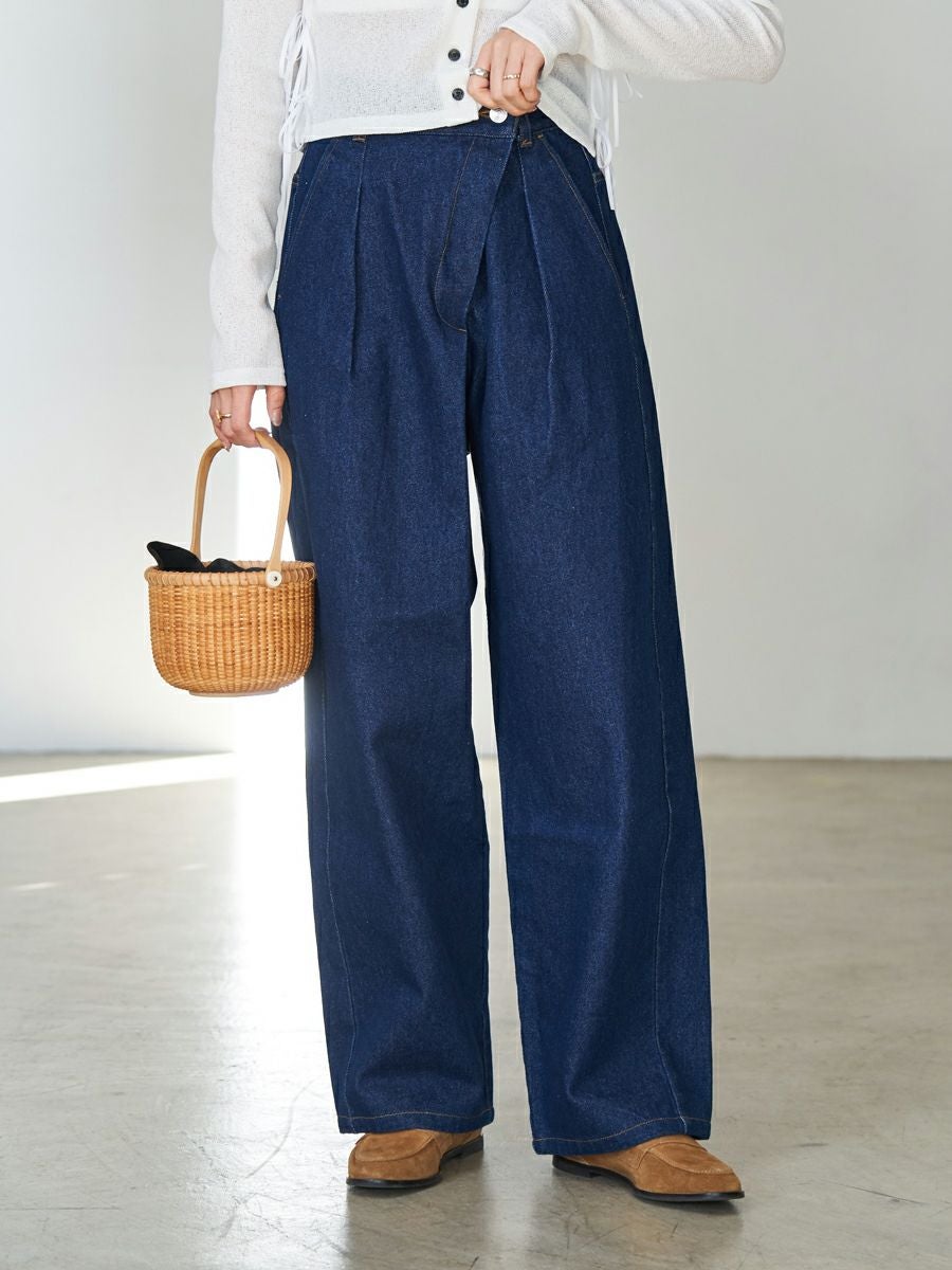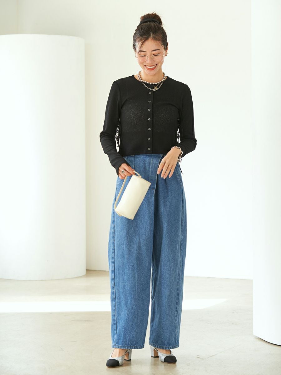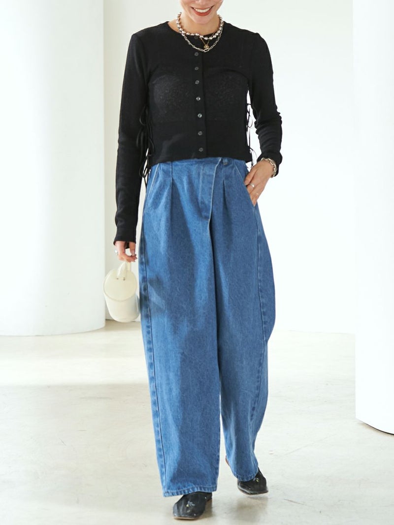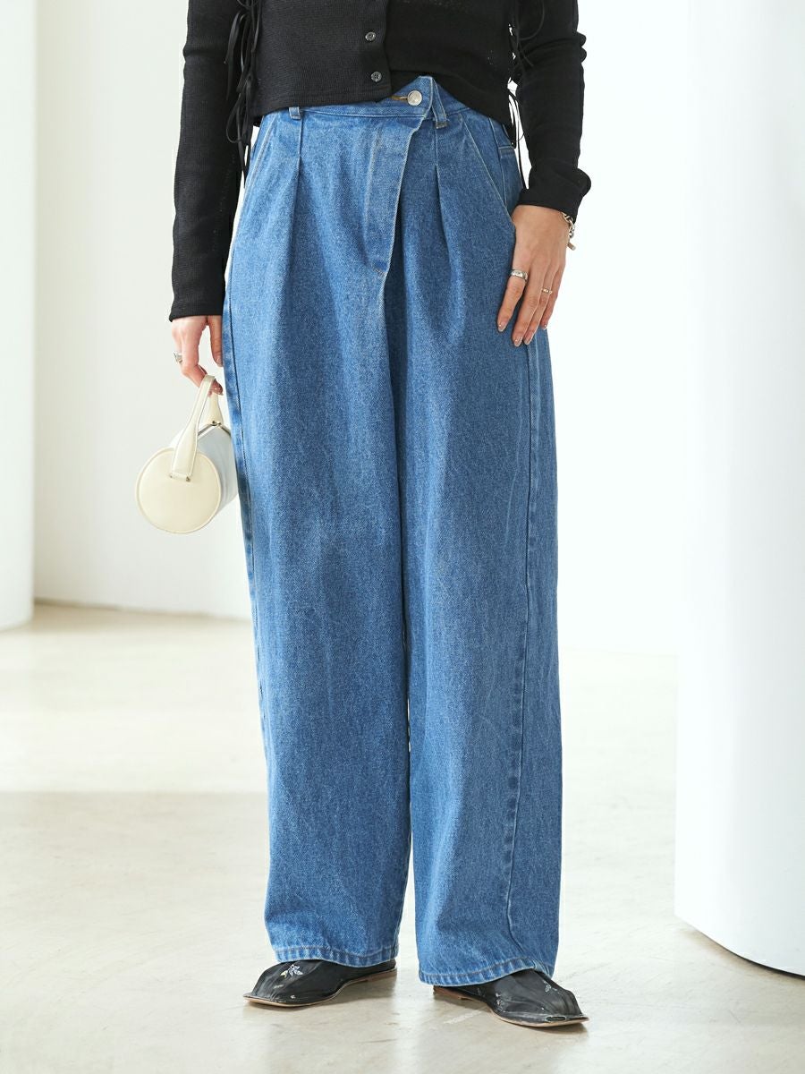デニムパンツにタックデザインとラップ調のウエストをプラスすることで腰回りのラインをカバーしつつ、シンプルなトップスとのコーディネートも様になるバランスに仕上げました。
