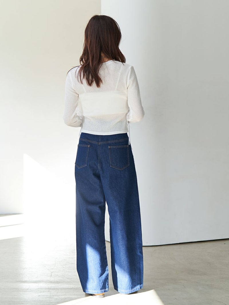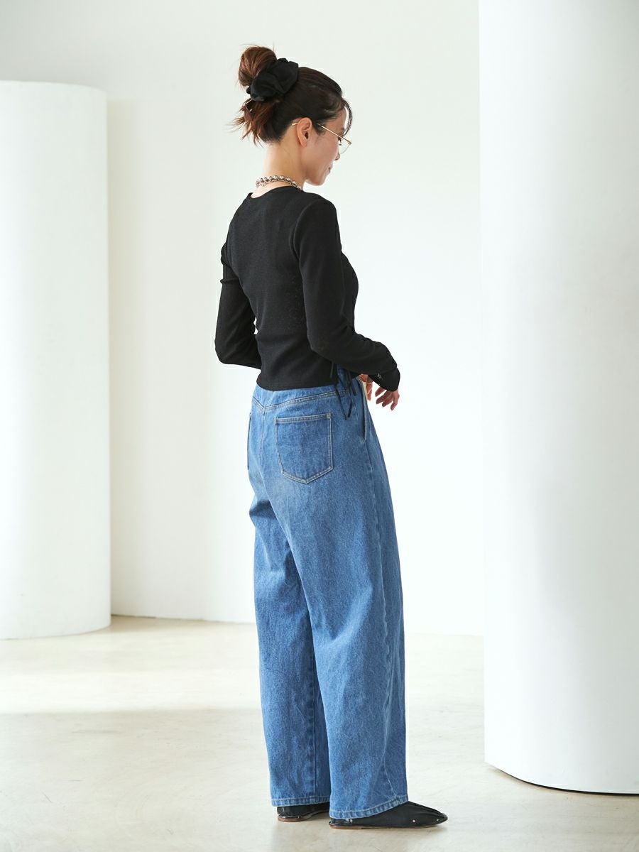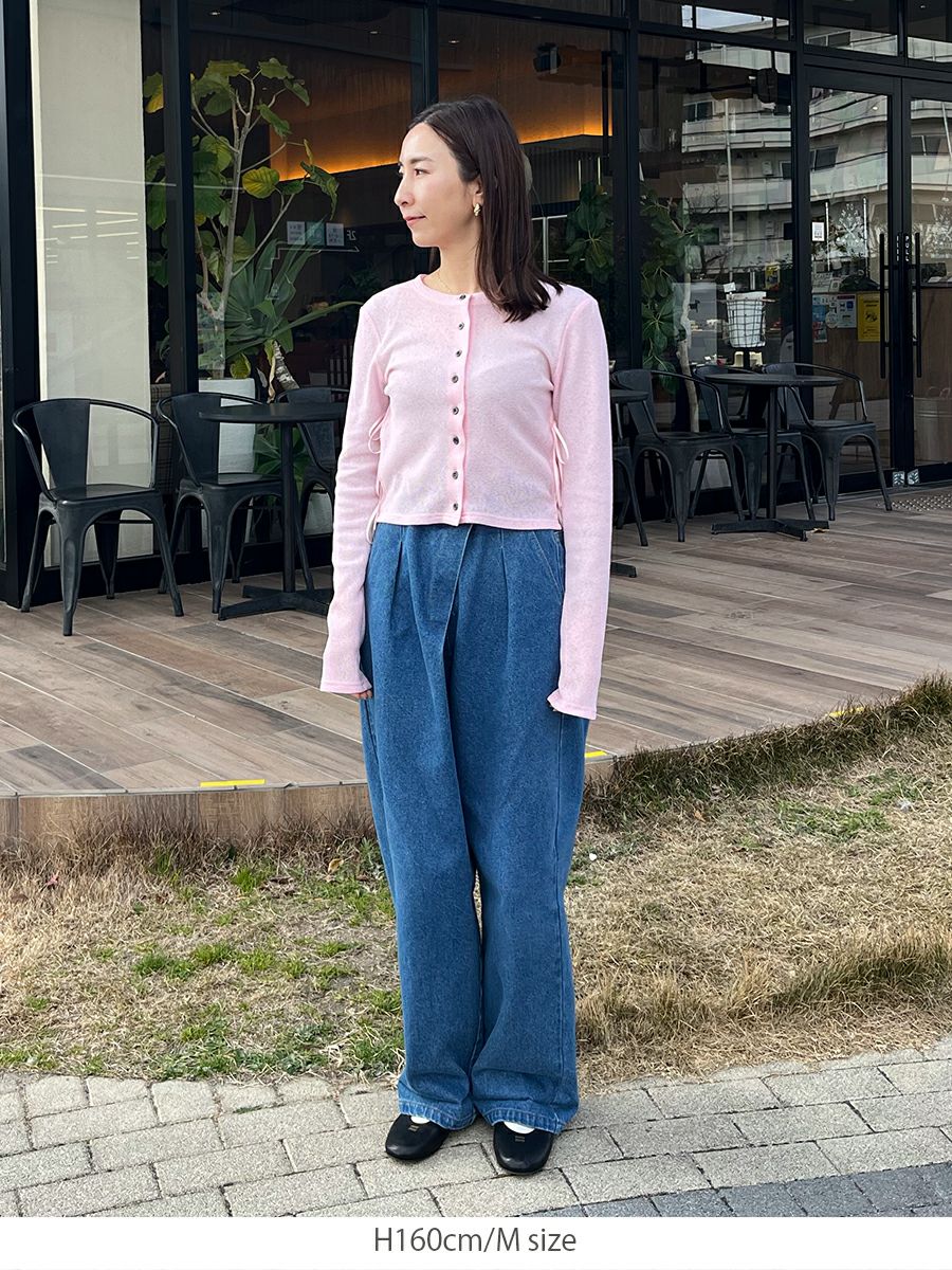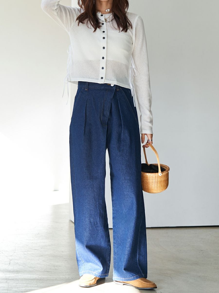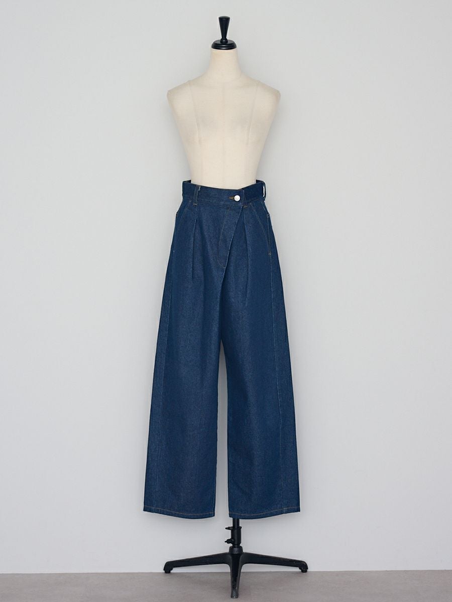 デニムパンツにタックデザインとラップ調のウエストをプラスすることで腰回りのラインをカバーしつつ、シンプルなトップスとのコーディネートも様になるバランスに仕上げました。