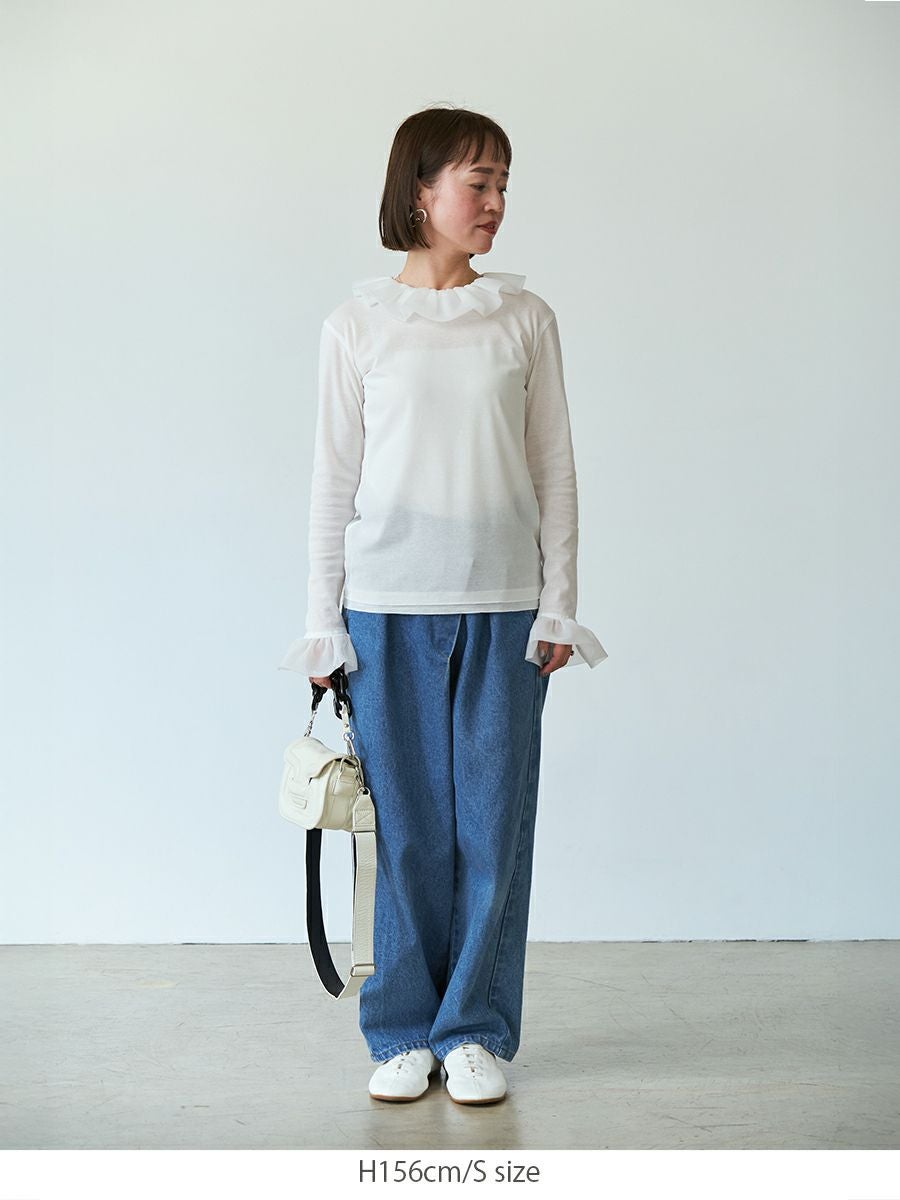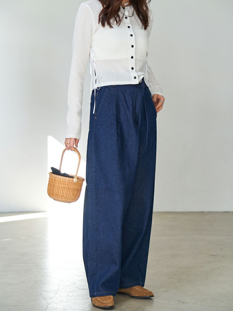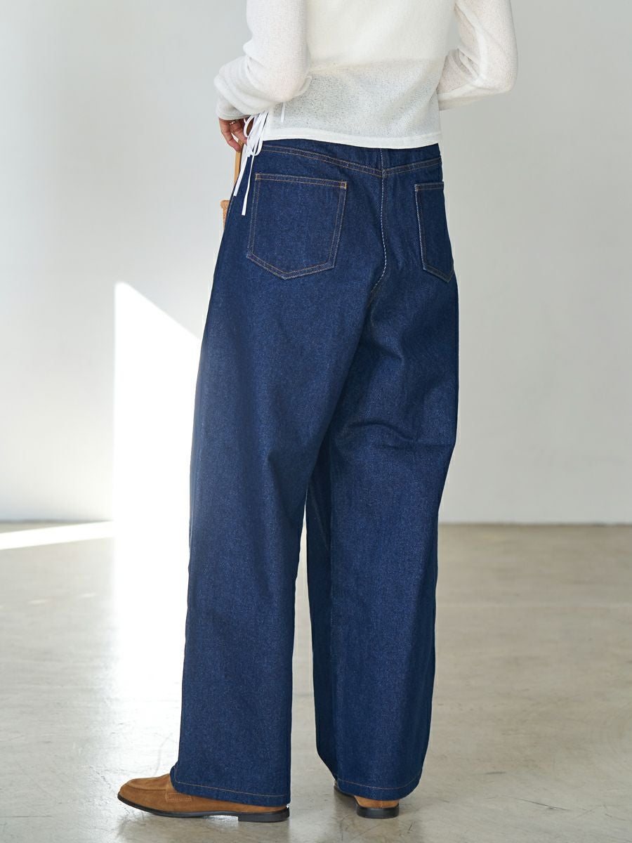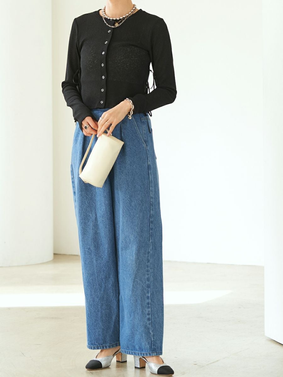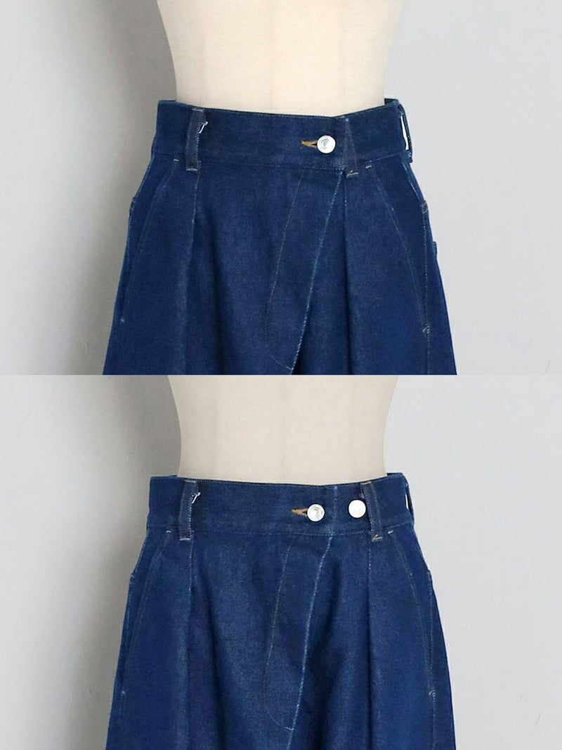 デニムパンツにタックデザインとラップ調のウエストをプラスすることで腰回りのラインをカバーしつつ、シンプルなトップスとのコーディネートも様になるバランスに仕上げました。
