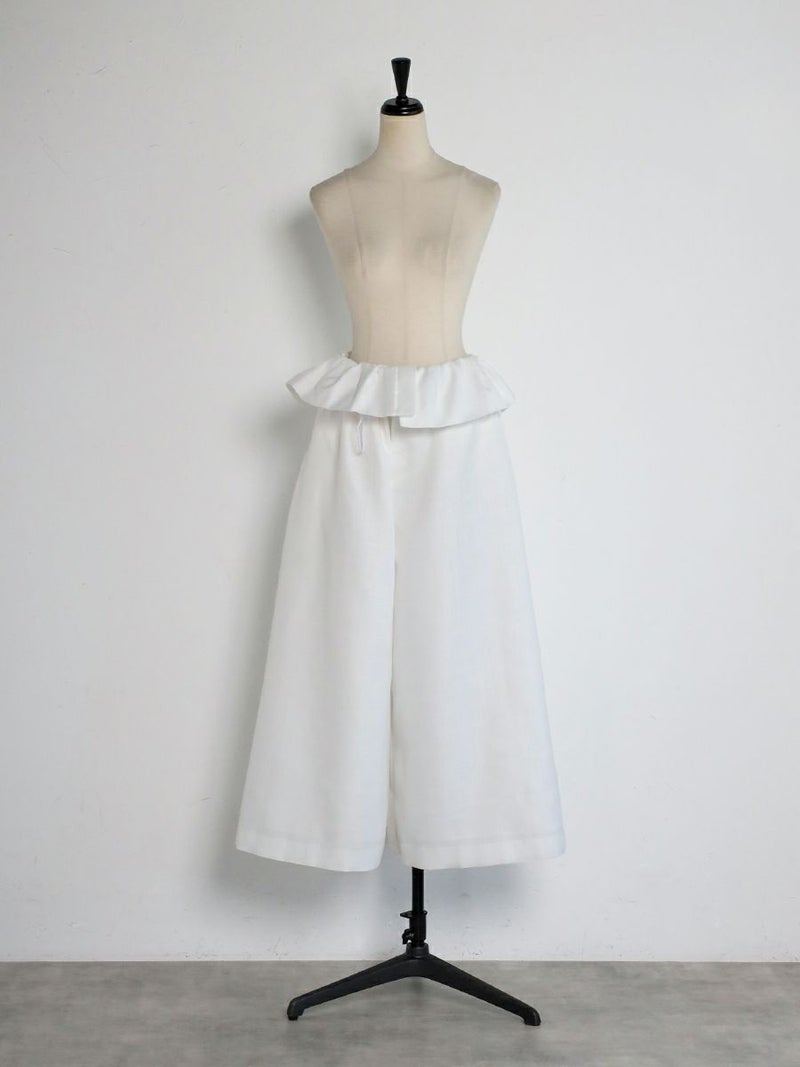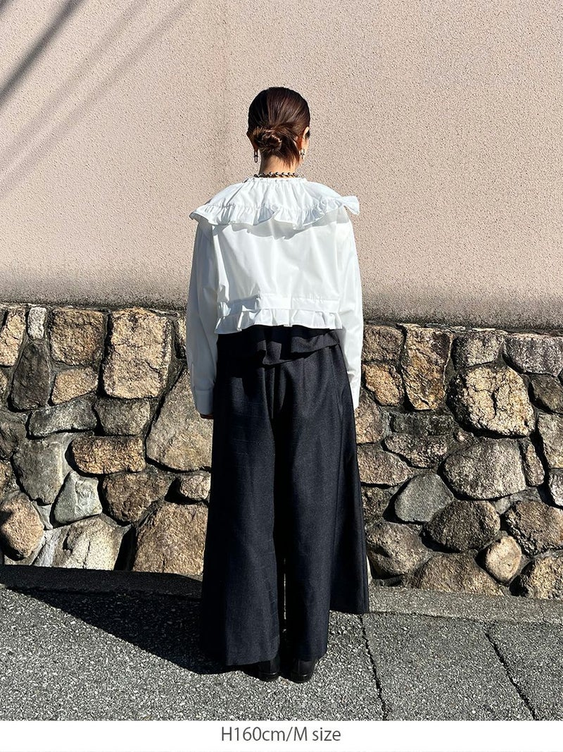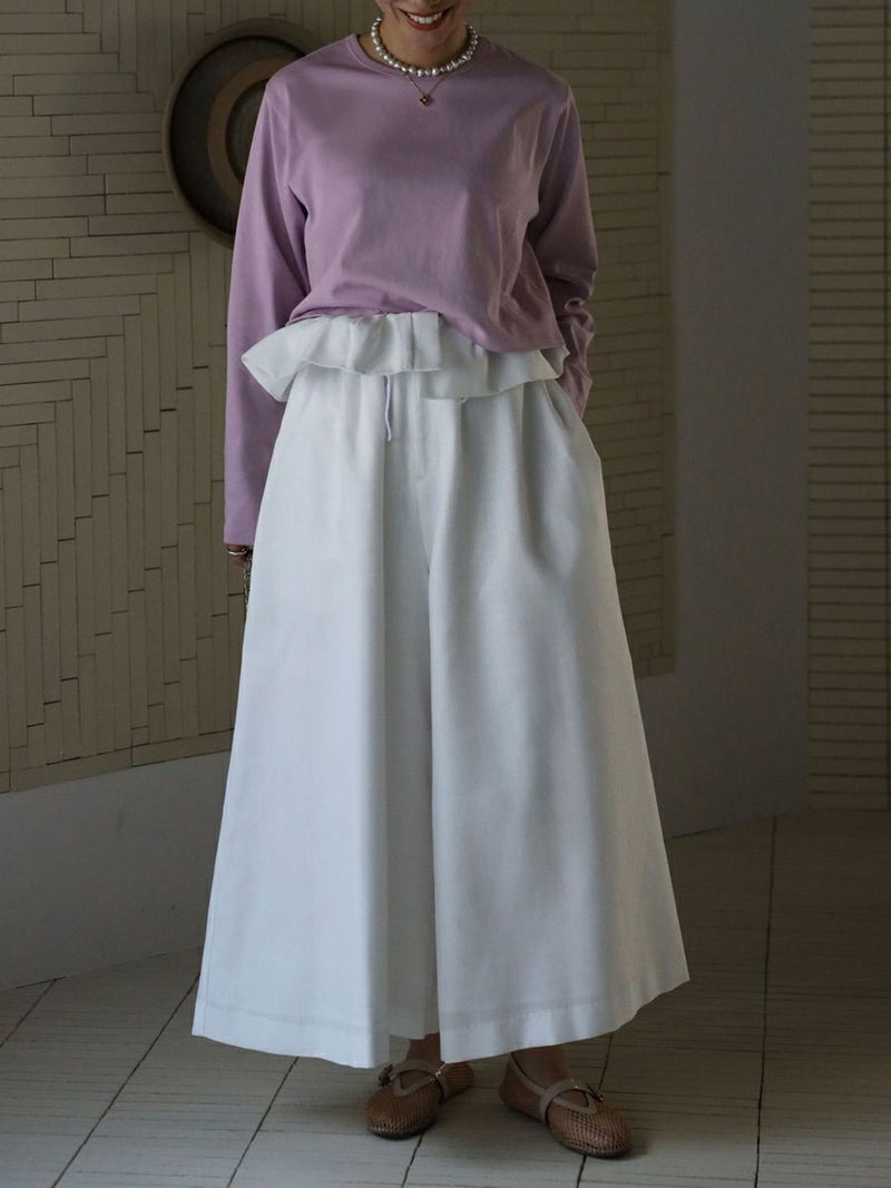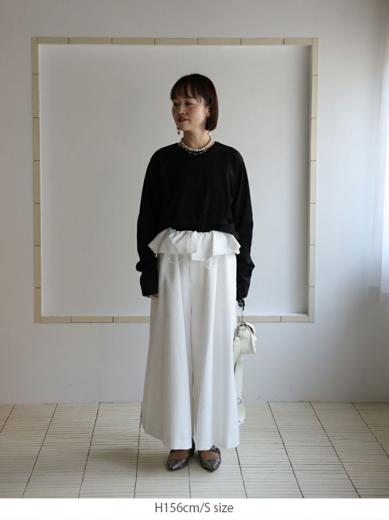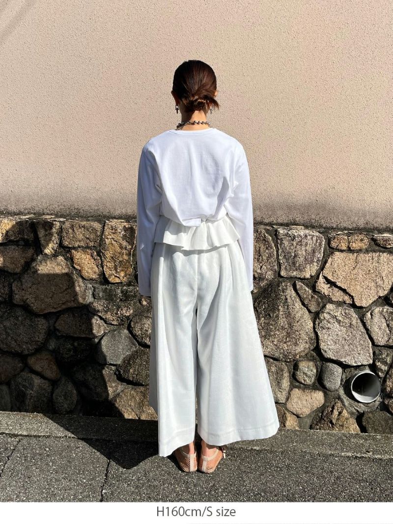 パンツですがスカート見えするボリュームにウエストのフリルデザインがポイント。