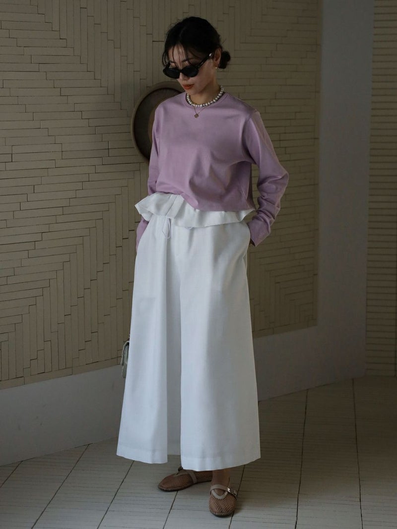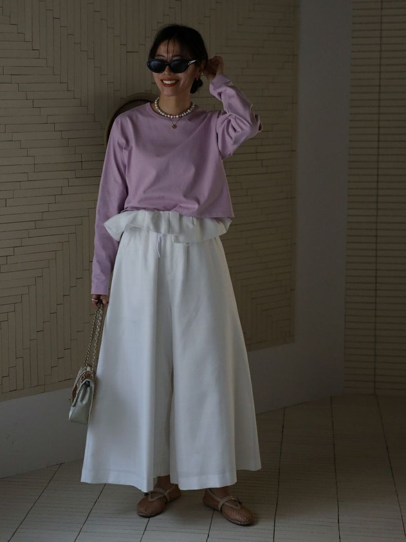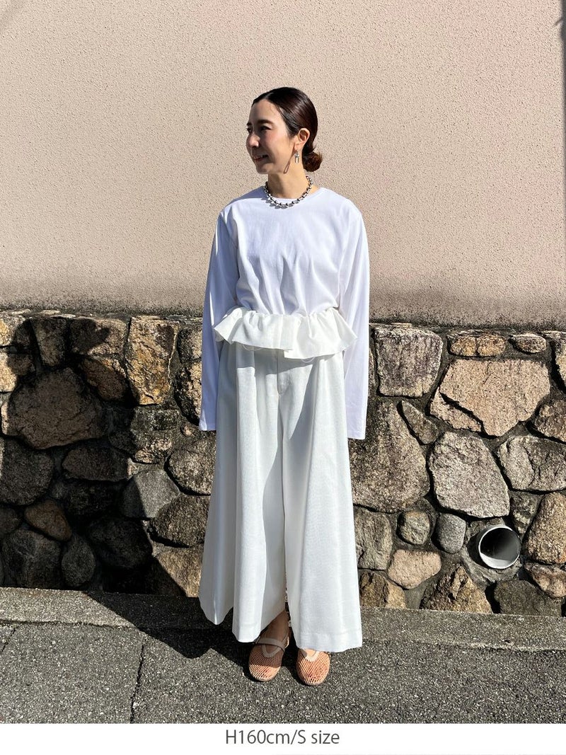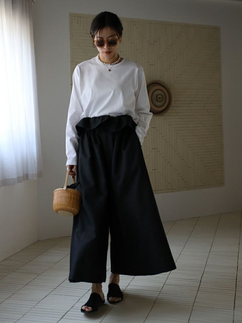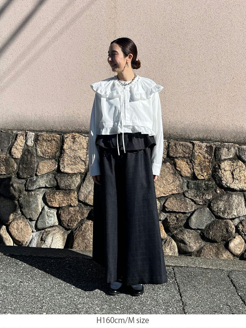 パンツですがスカート見えするボリュームにウエストのフリルデザインがポイント。