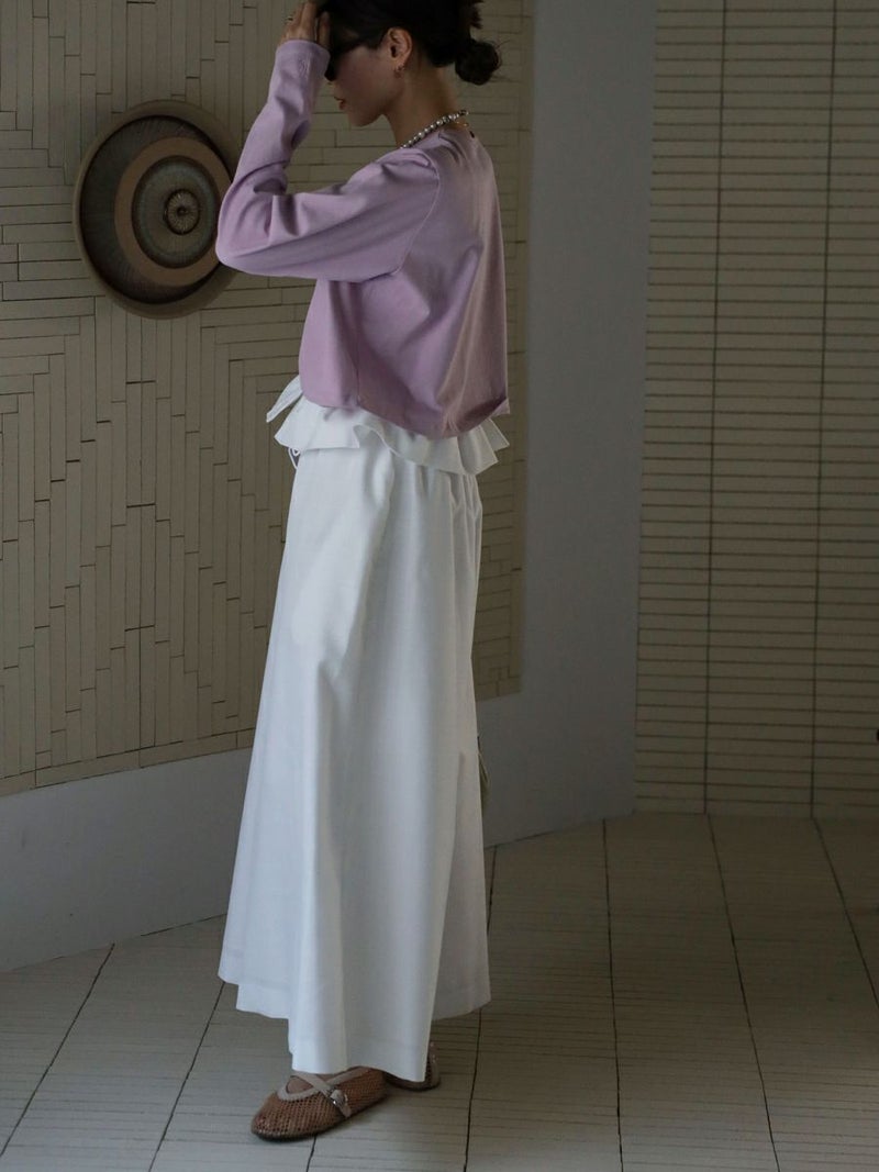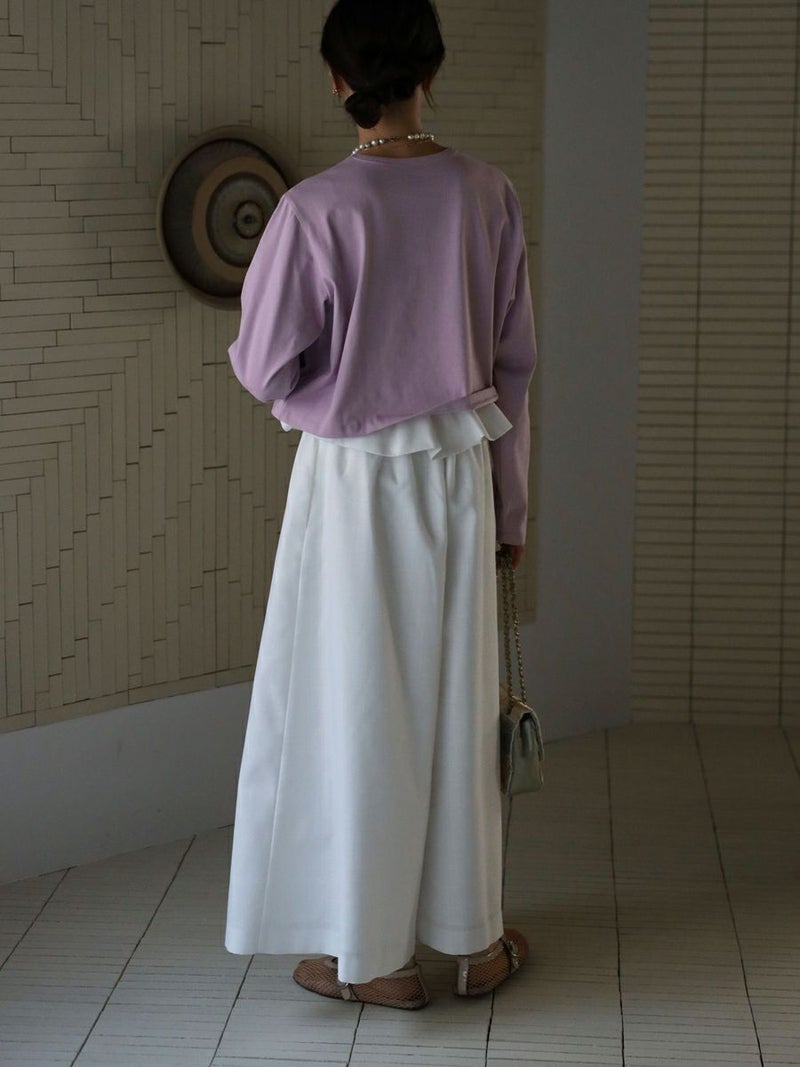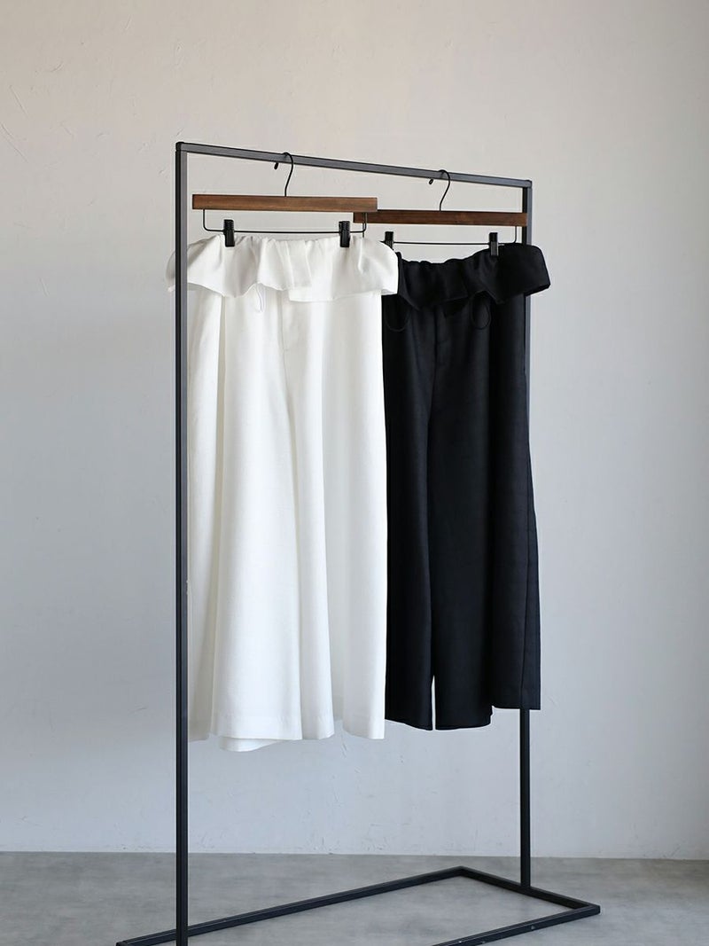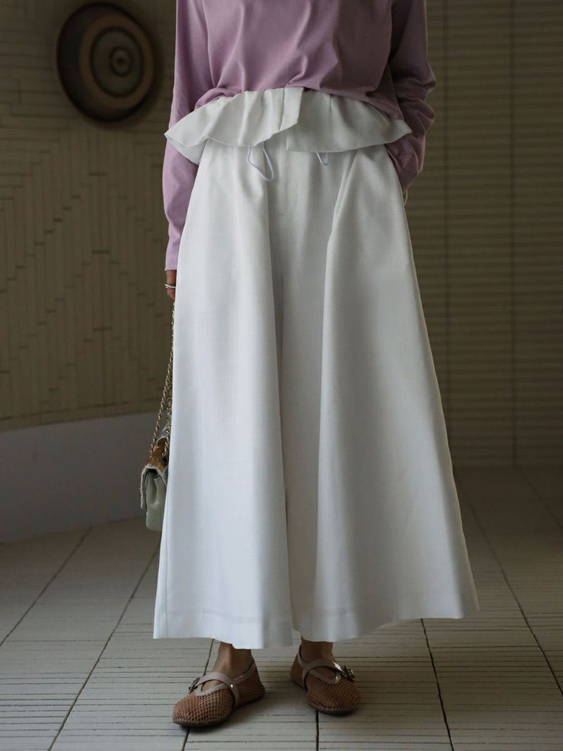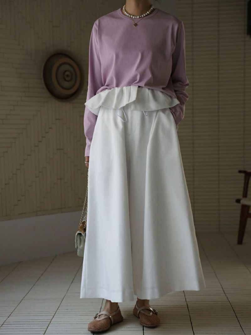 パンツですがスカート見えするボリュームにウエストのフリルデザインがポイント。