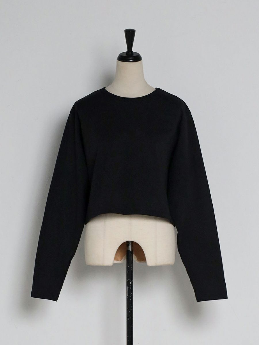 詰まったネックラインとほど良くゆとりのあるシルエットで体のラインを拾わずヘルシーなバランスに仕上げた一枚。