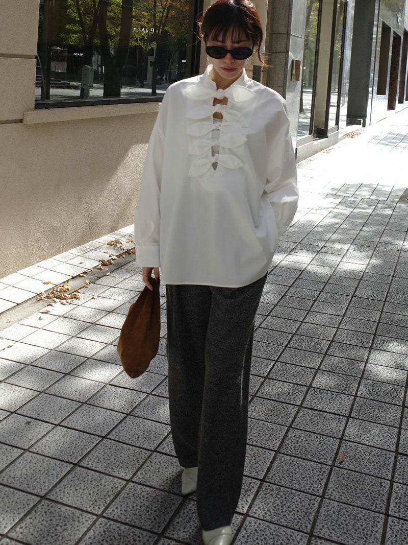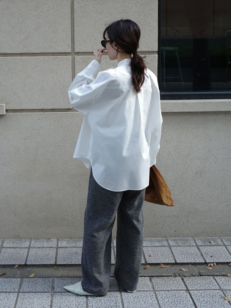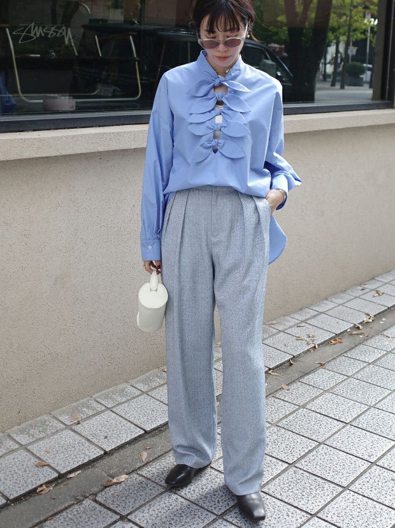 ニットやカーディガンを合わせてリラックス感を出したり、シャツやジャケットでクラシカルにまとめたりと、幅広いコーディネートに馴染む万能アイテム。