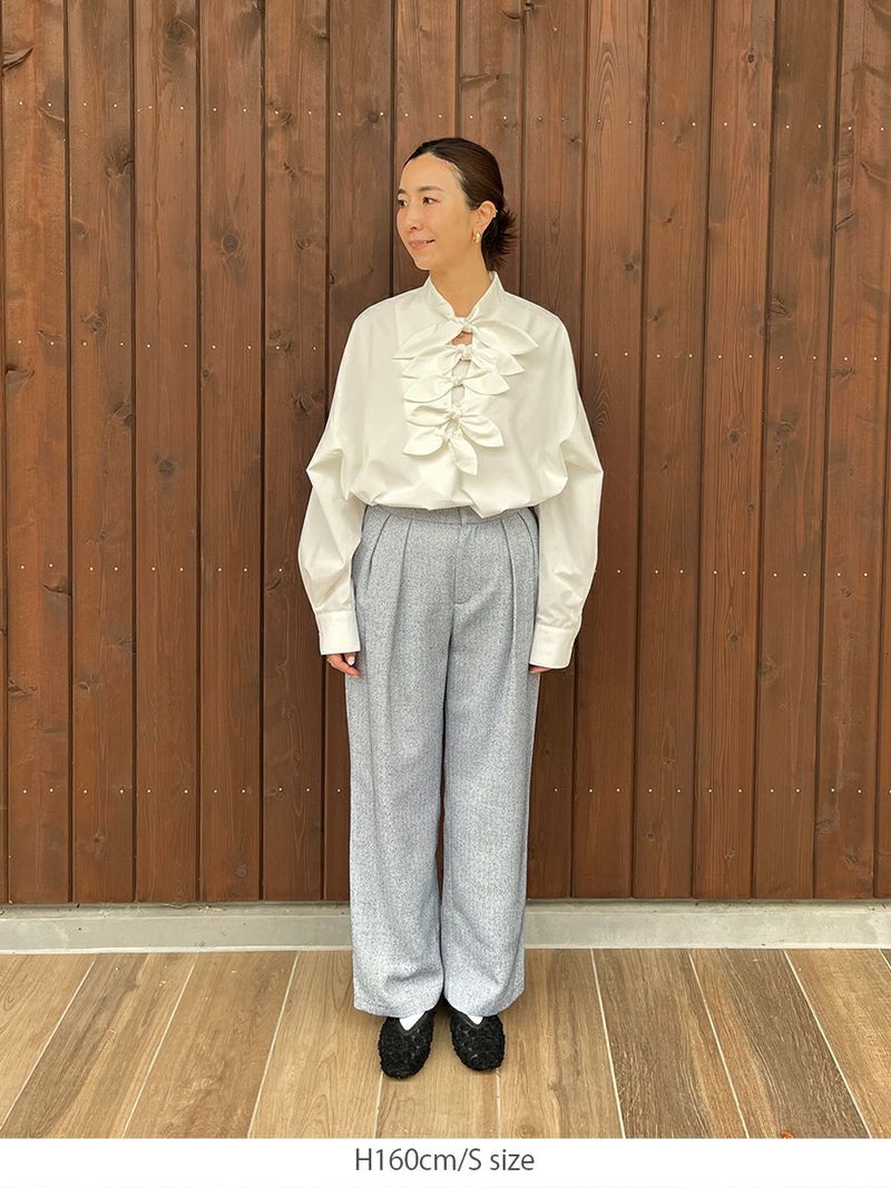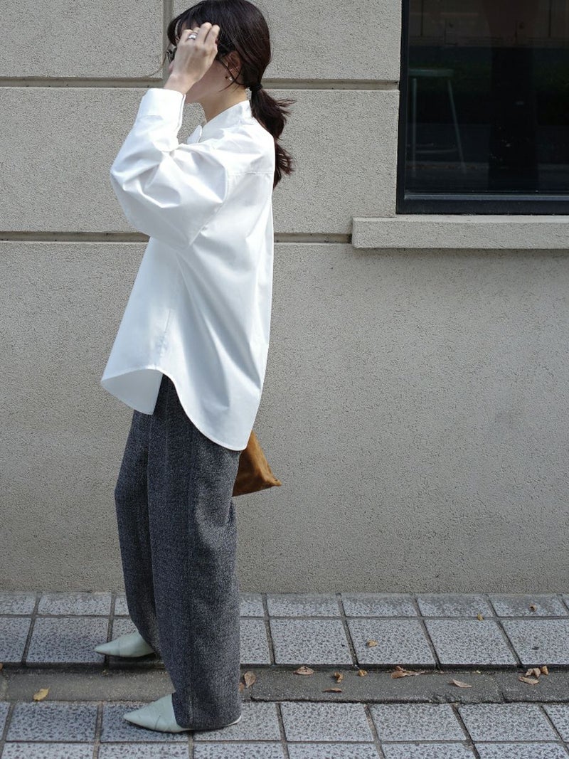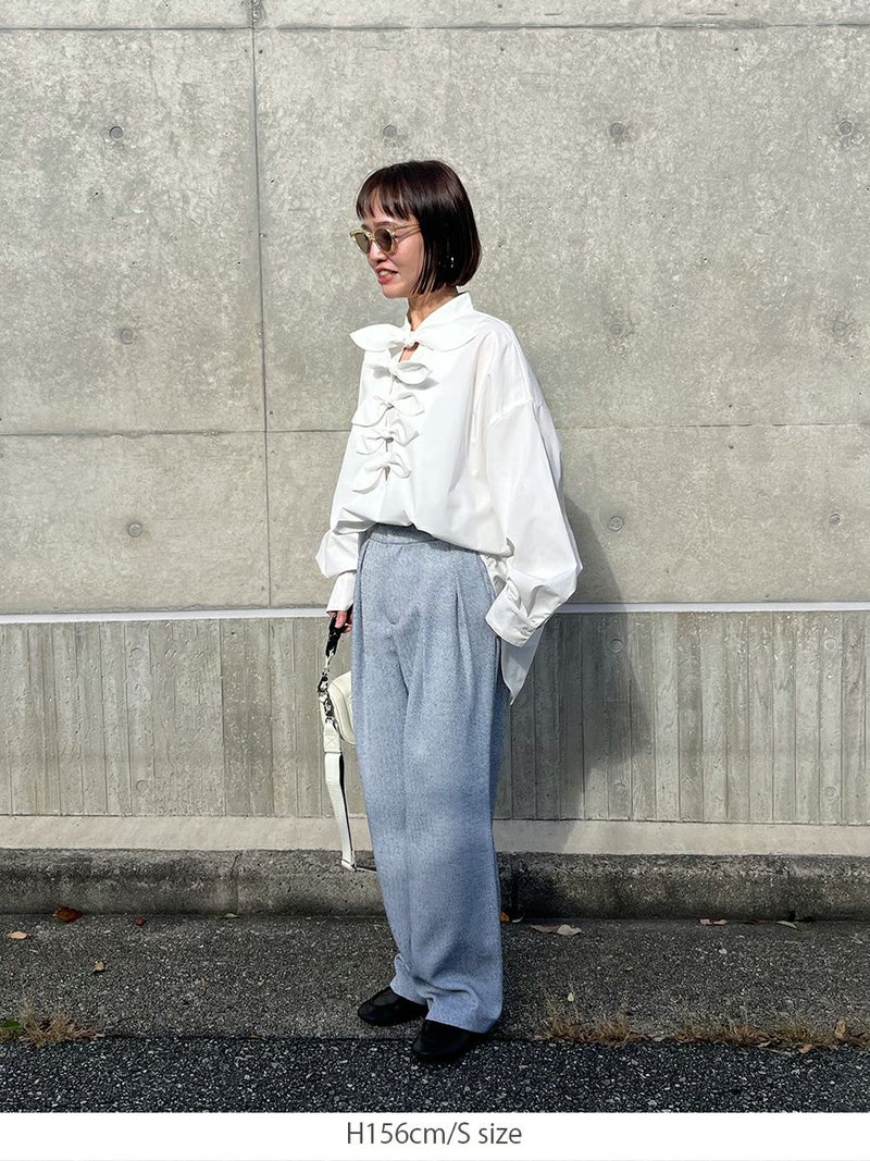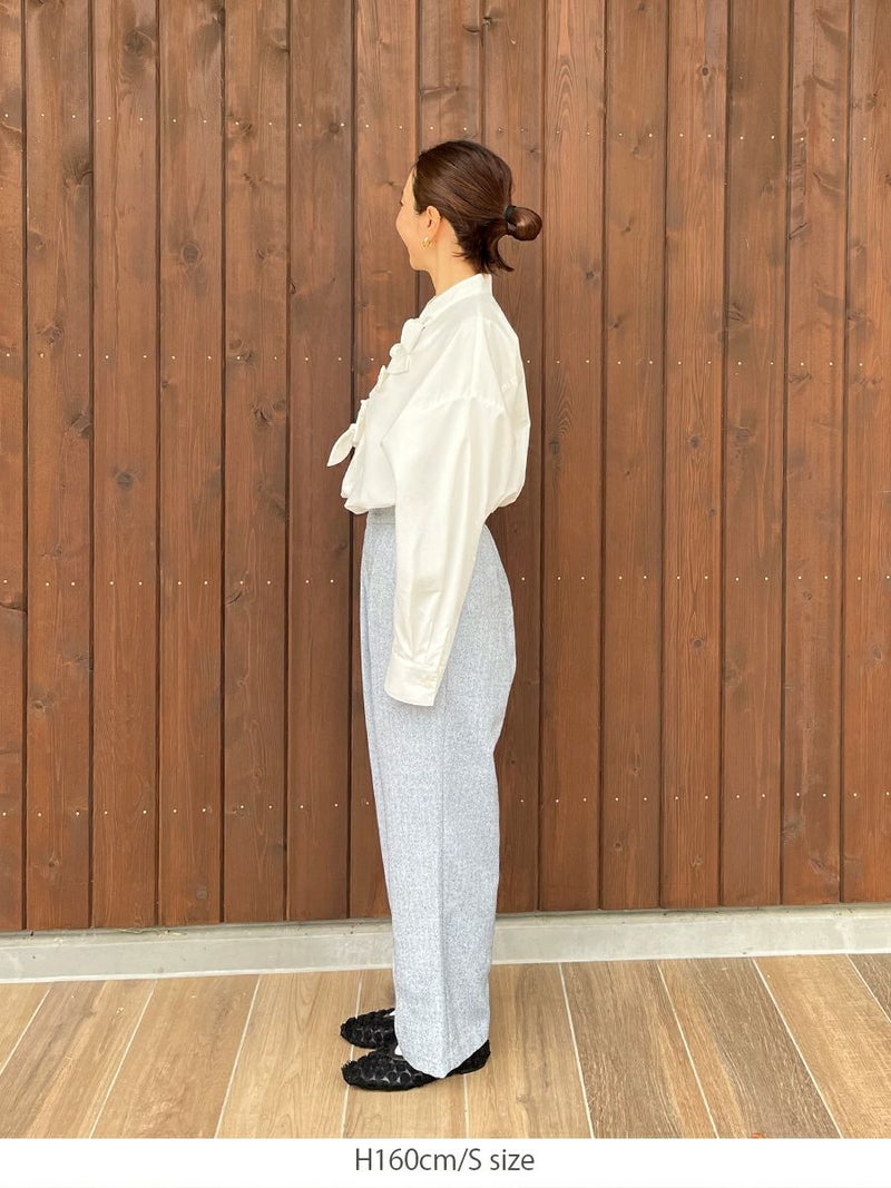 ツータックの入ったセミワイドシルエットは、腰まわりをすっきりと見せながらも、足元にかけて自然な落ち感を描きます。