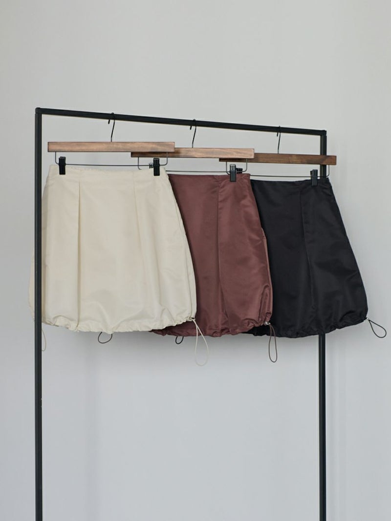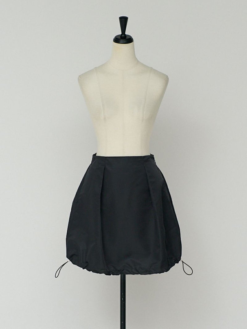 軽やかなナイロン素材で仕立てたミニスカートは、程よい光沢感が上品な印象を添える一枚。