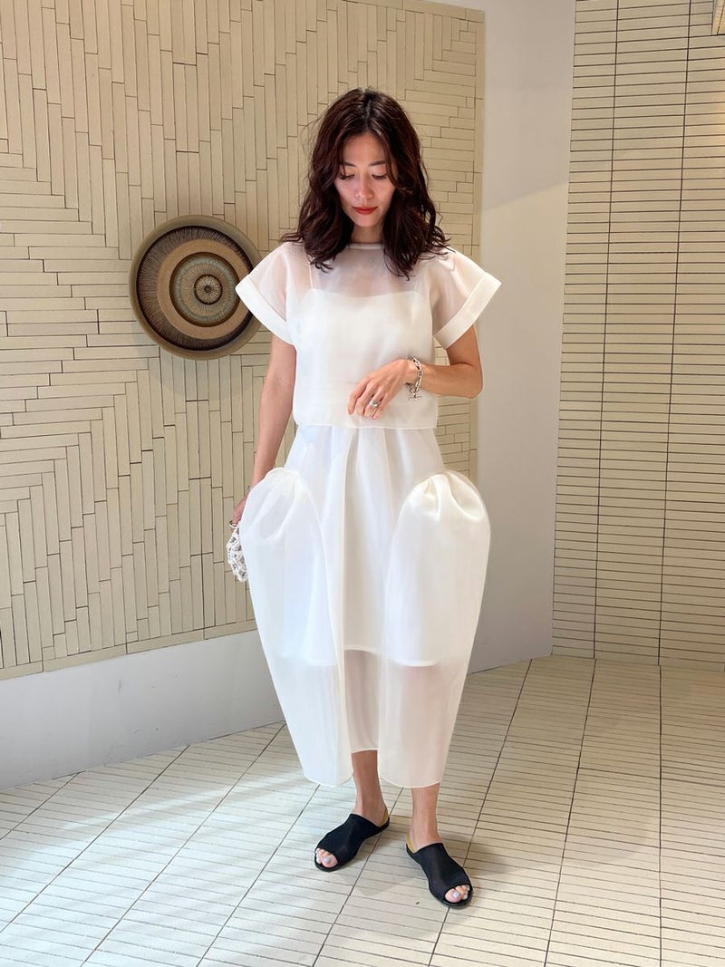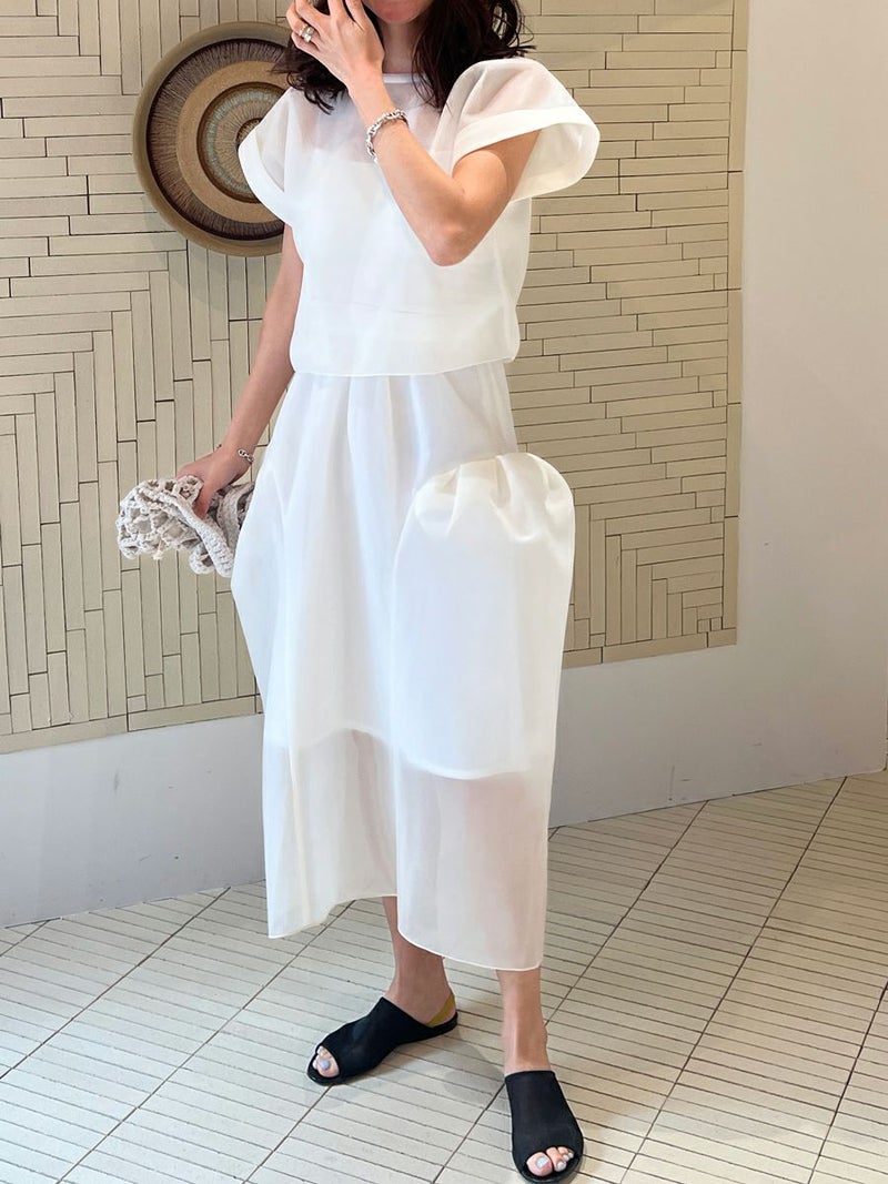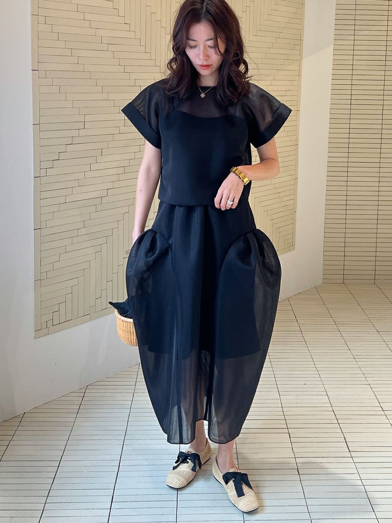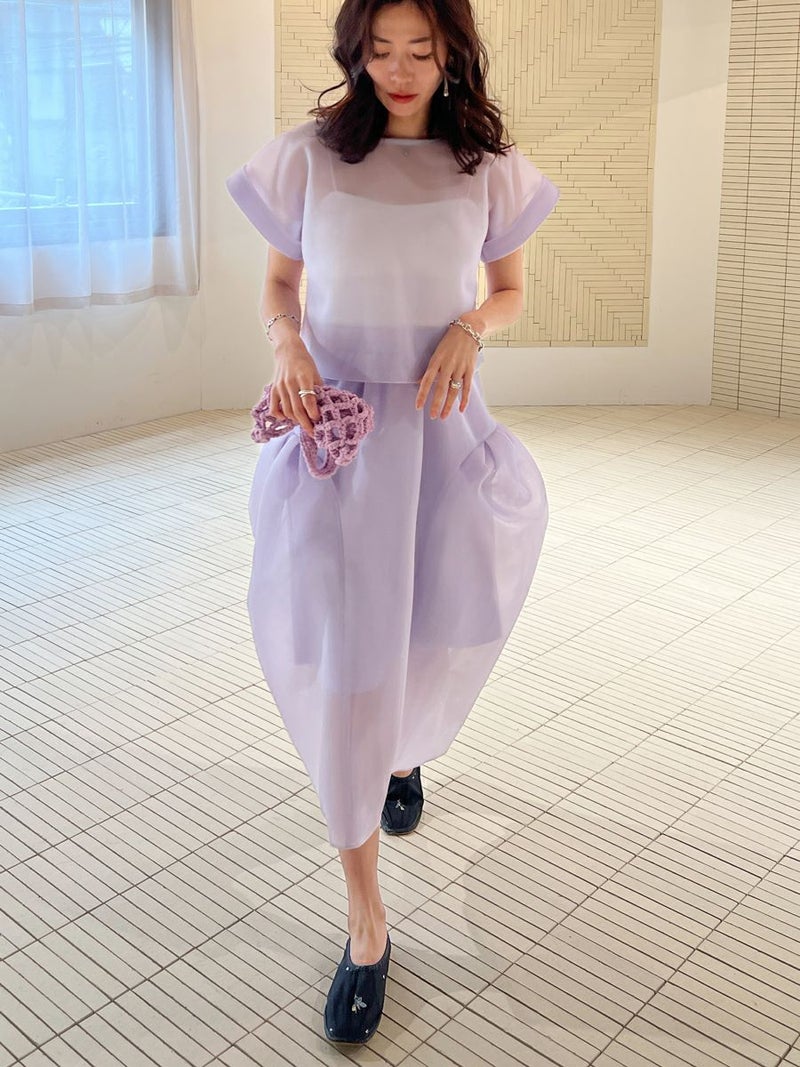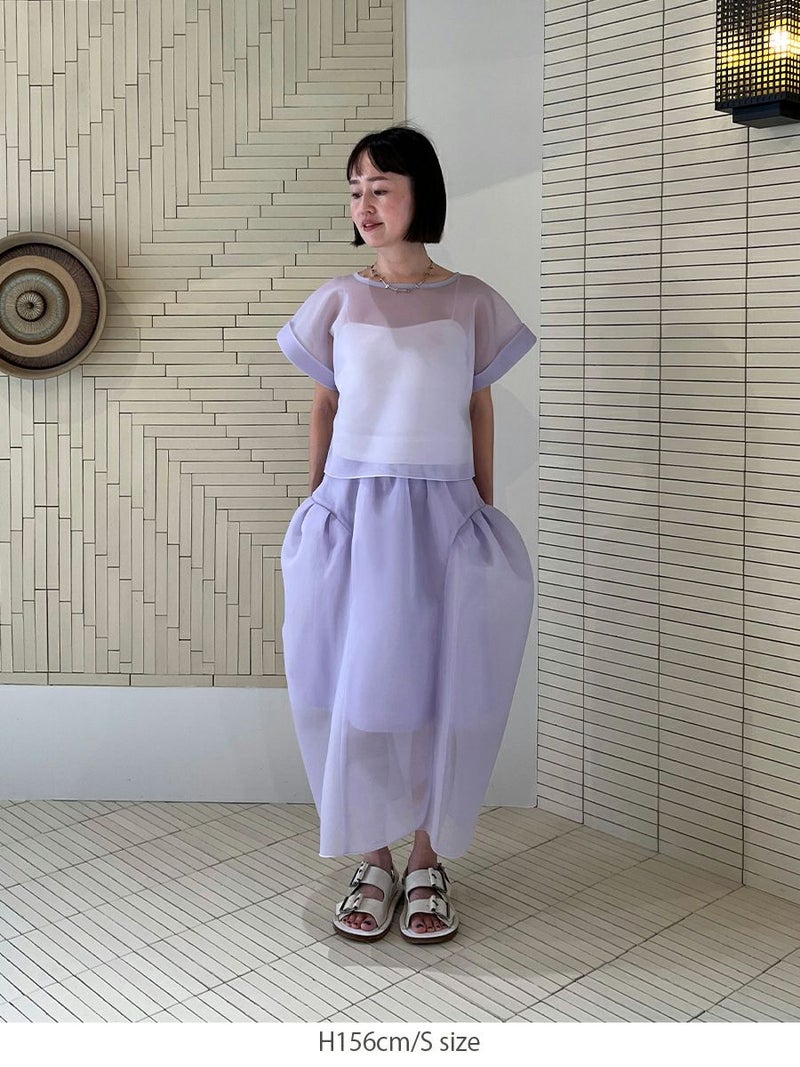 また同素材のSHEER TOPS ともバランスよく着こなせ、セットアップスタイルを楽しめます。