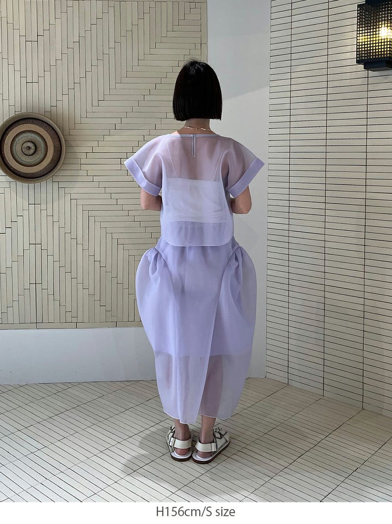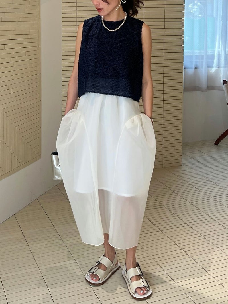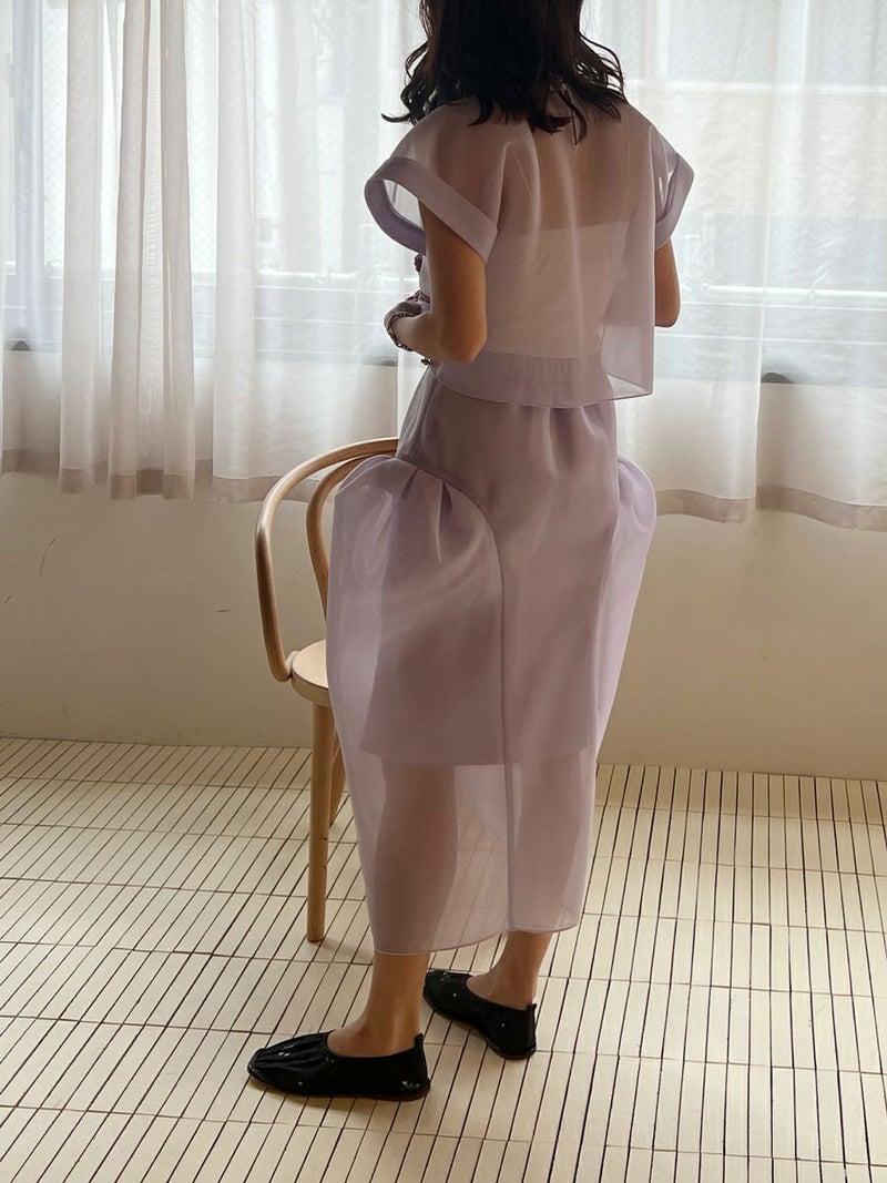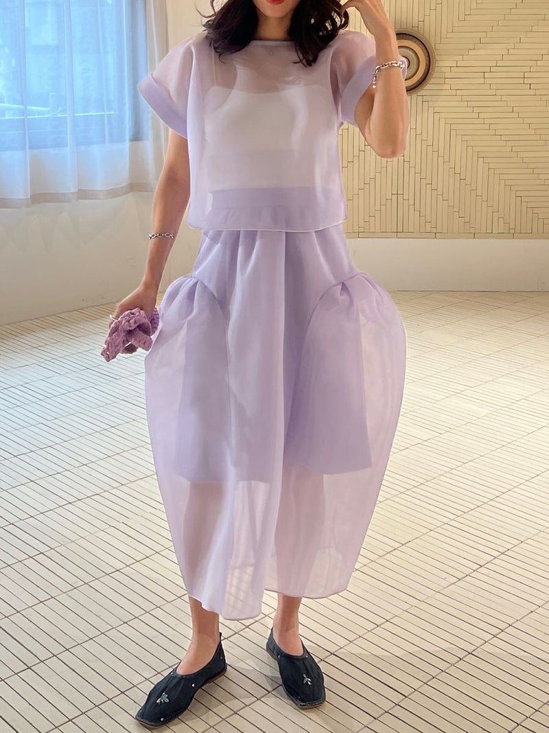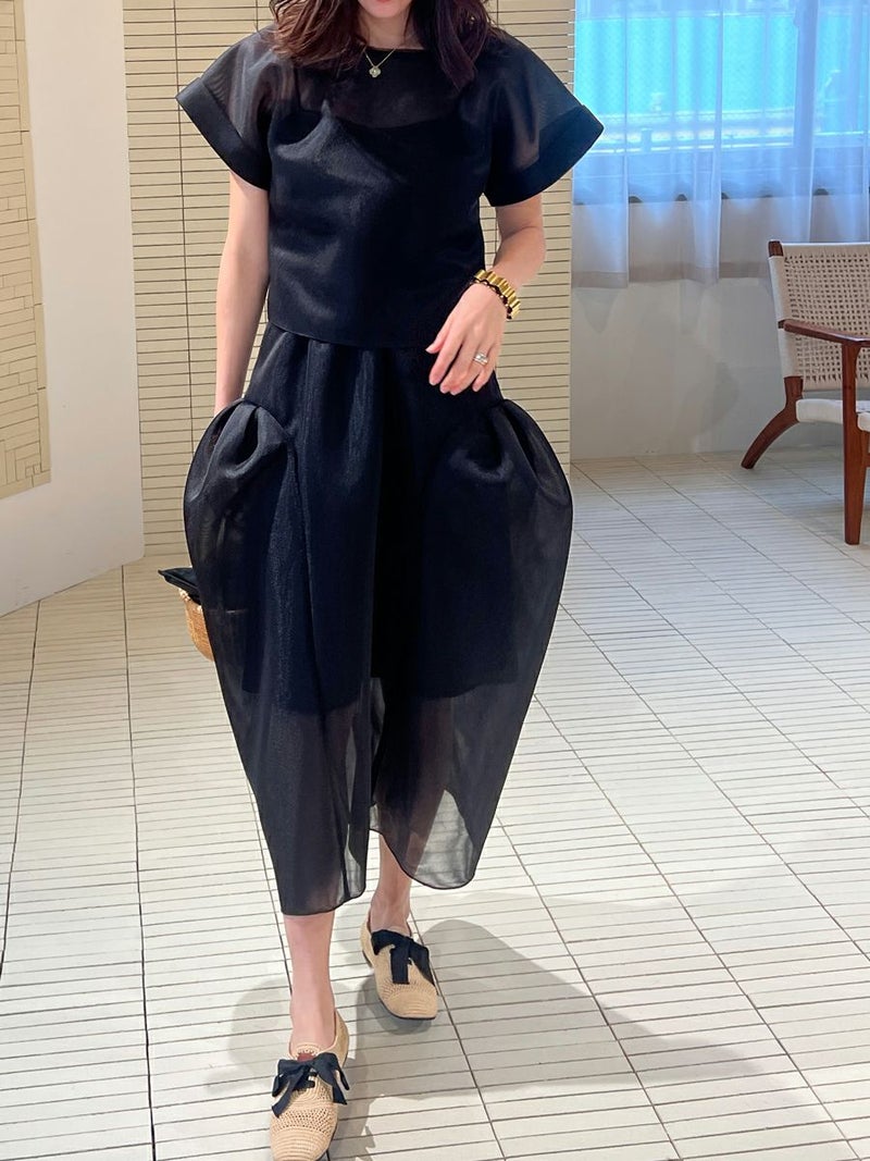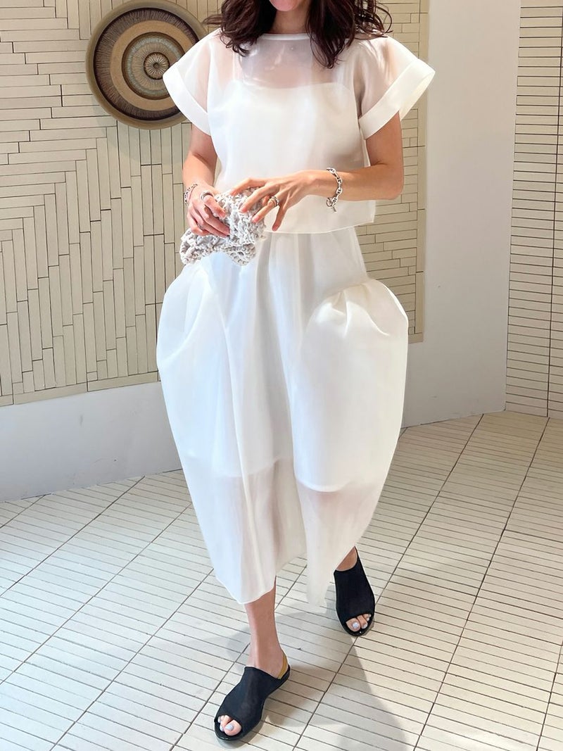 また同素材のSHEER TOPS ともバランスよく着こなせ、セットアップスタイルを楽しめます。