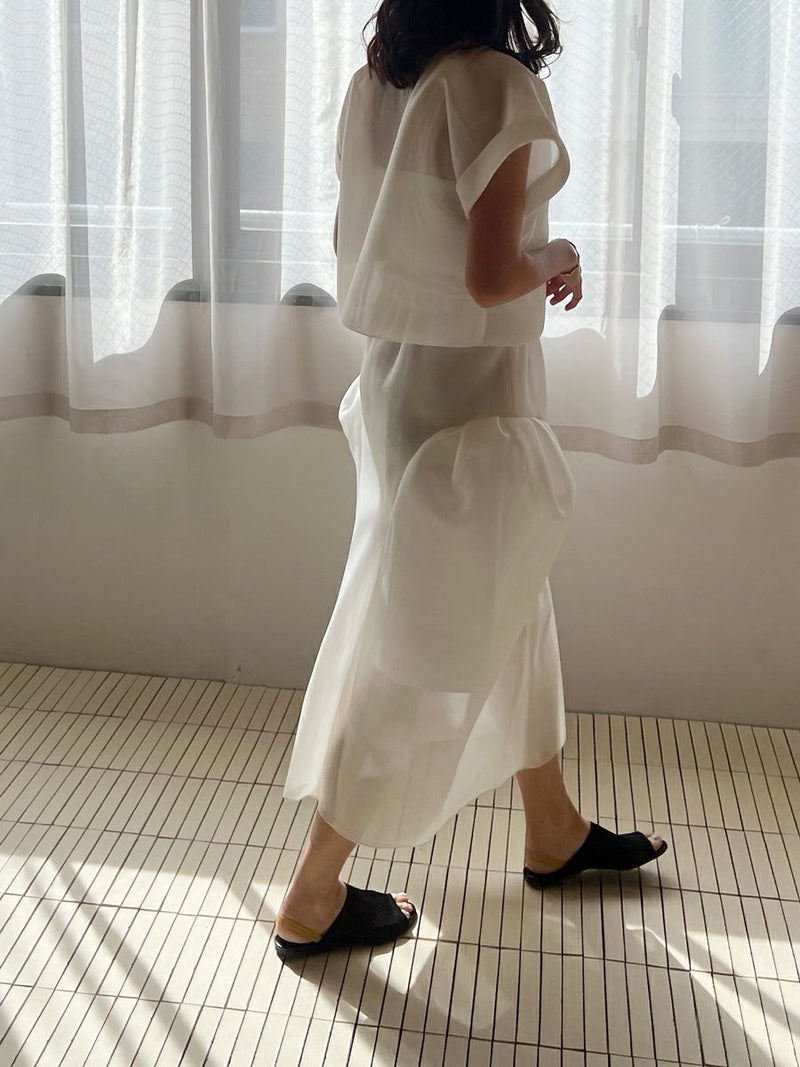 敢えて裏地を短くすることでよりシアー感を楽しんで頂ける大人のスカートに仕上がっています。