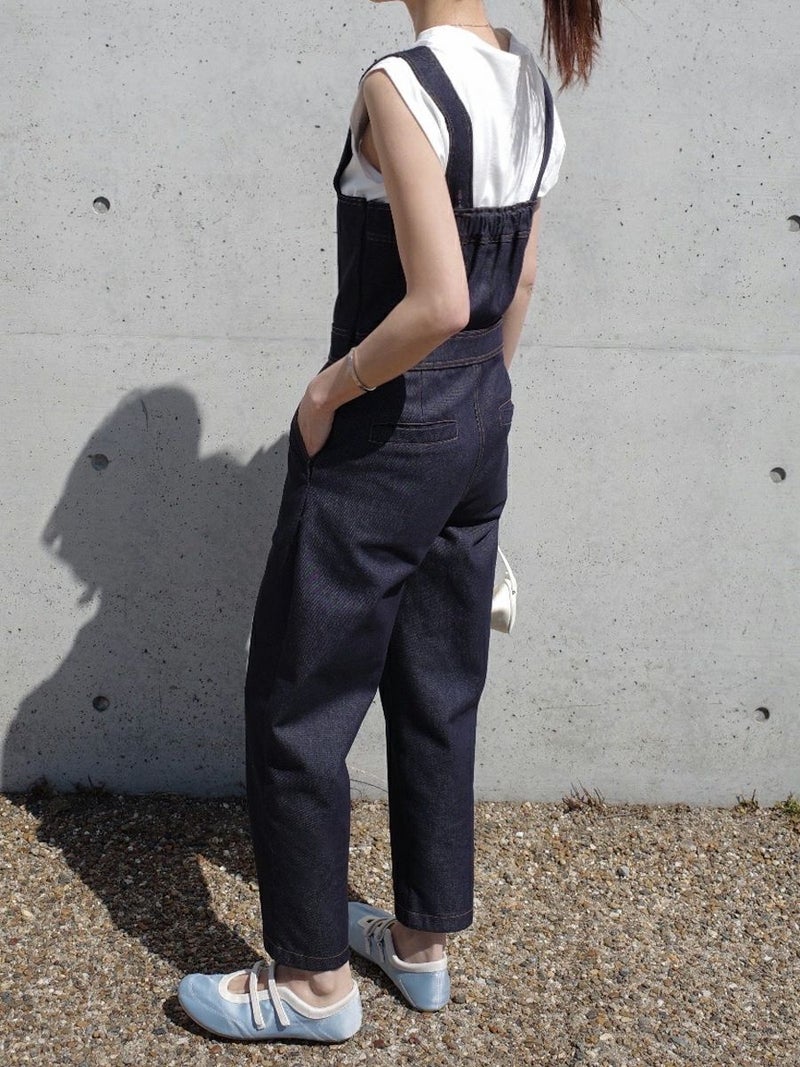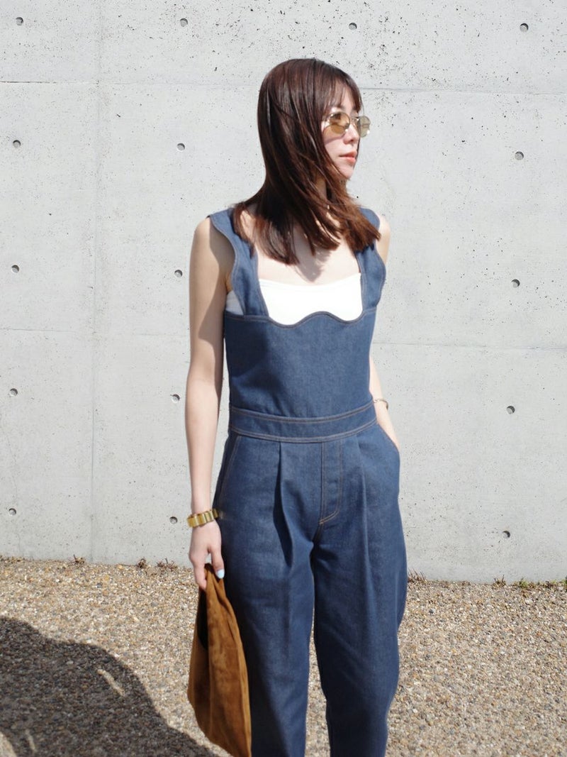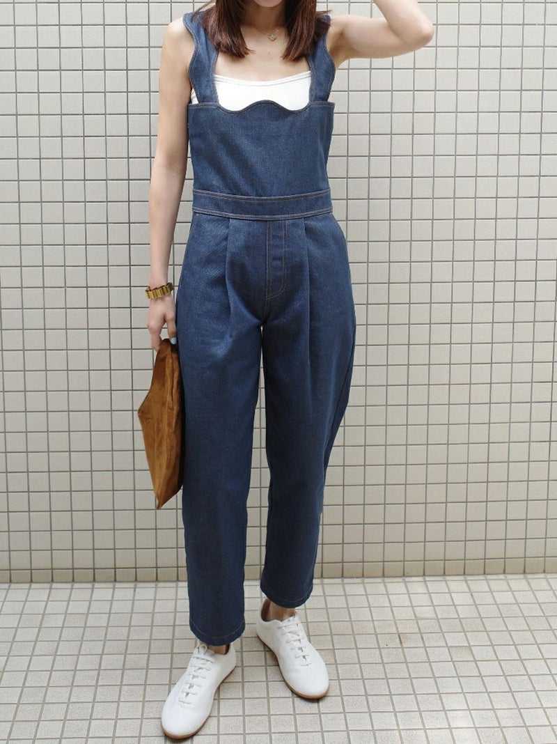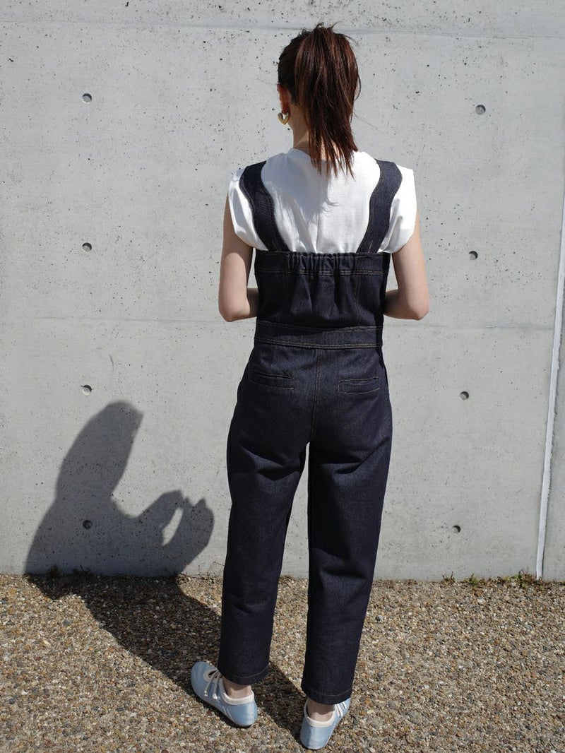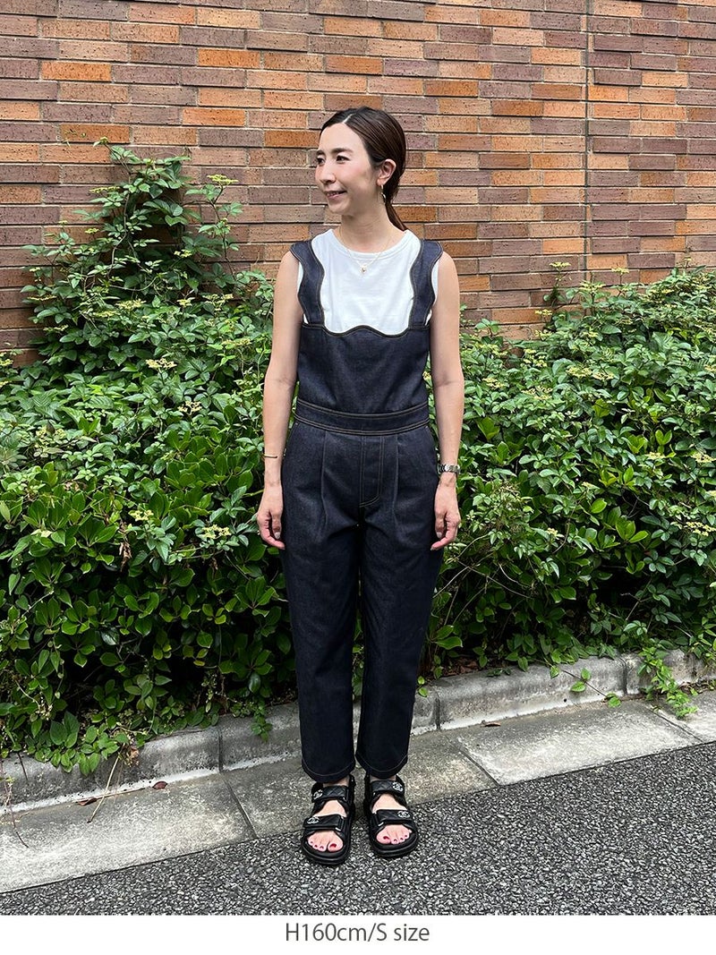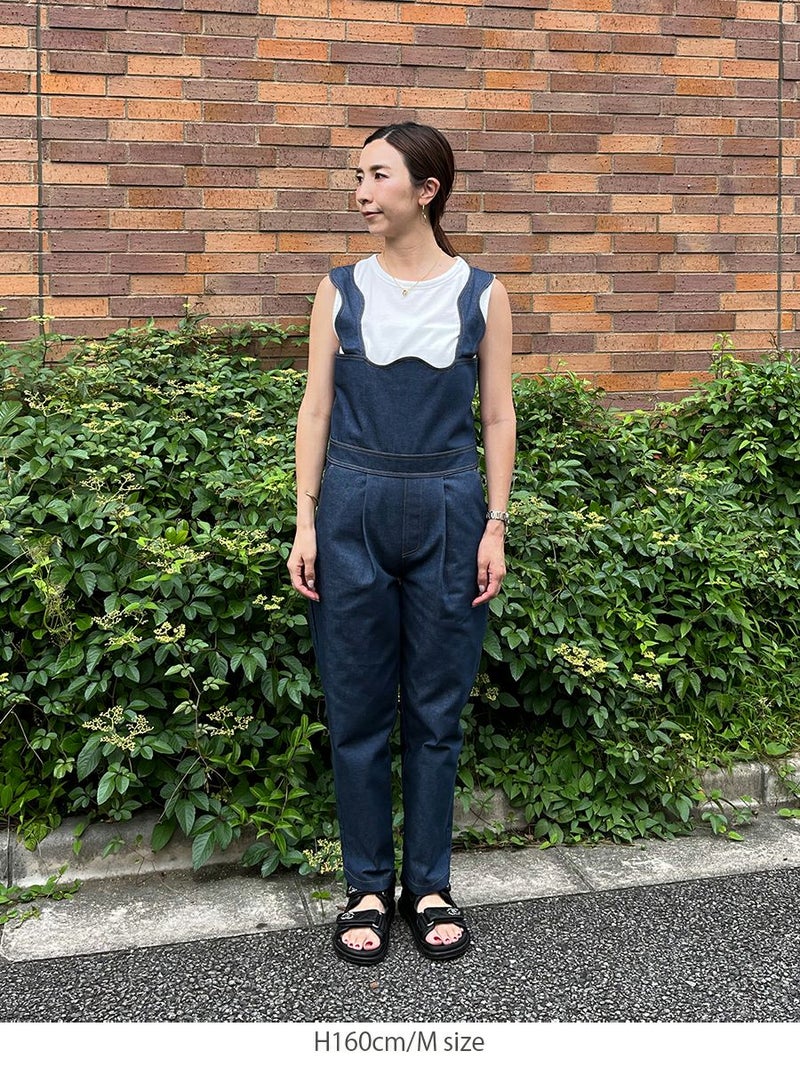 履きやすく色落ちしにくいデニム生地でお作りした女性らしいシルエットを叶えてくれるデニムサロペット。