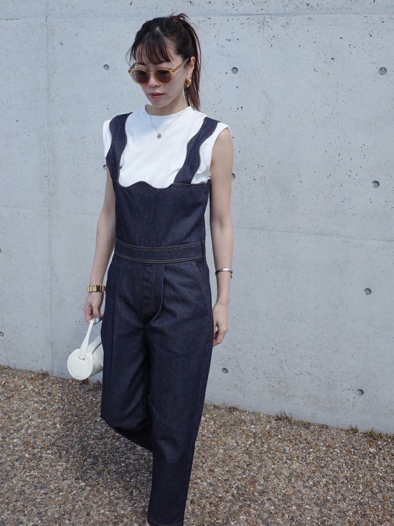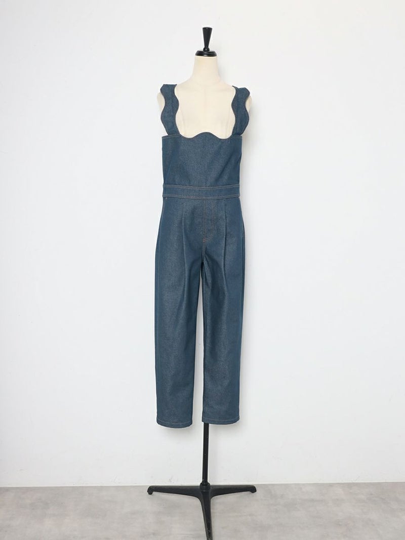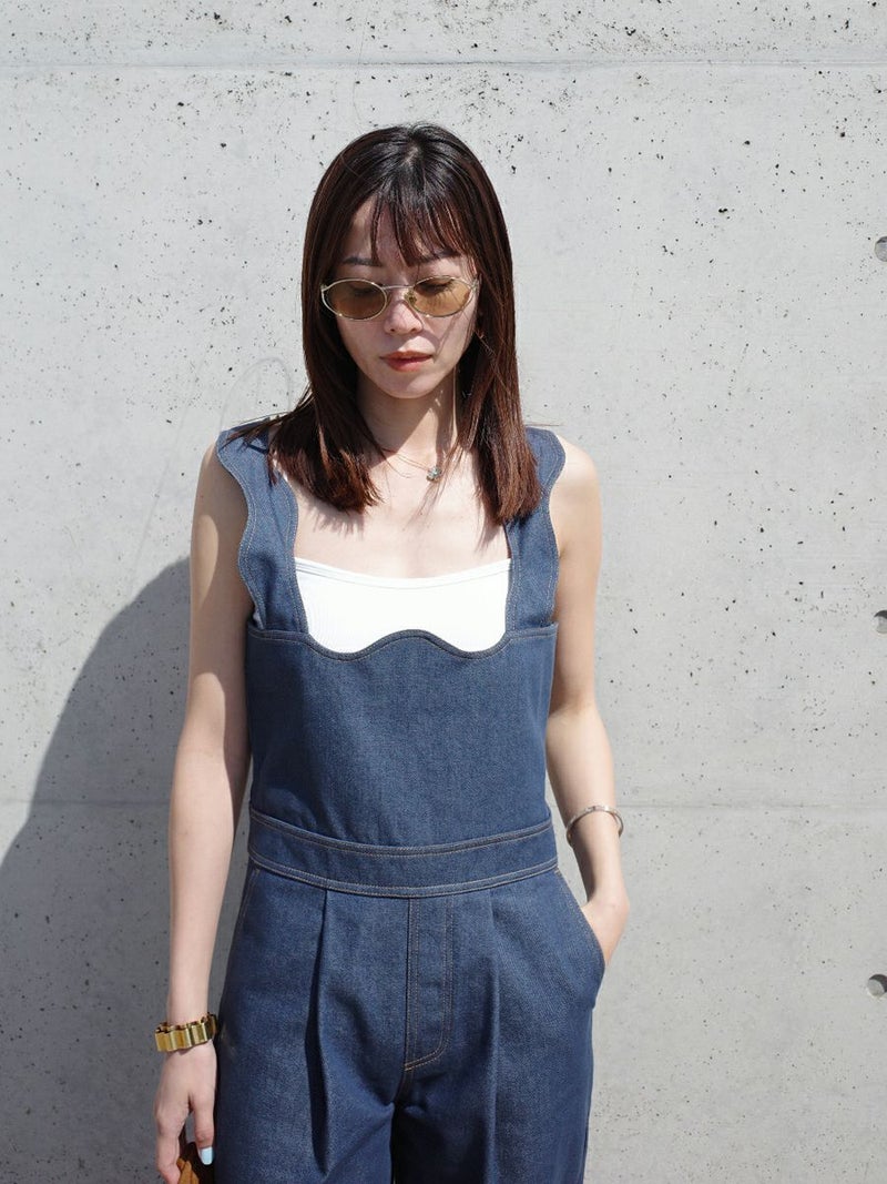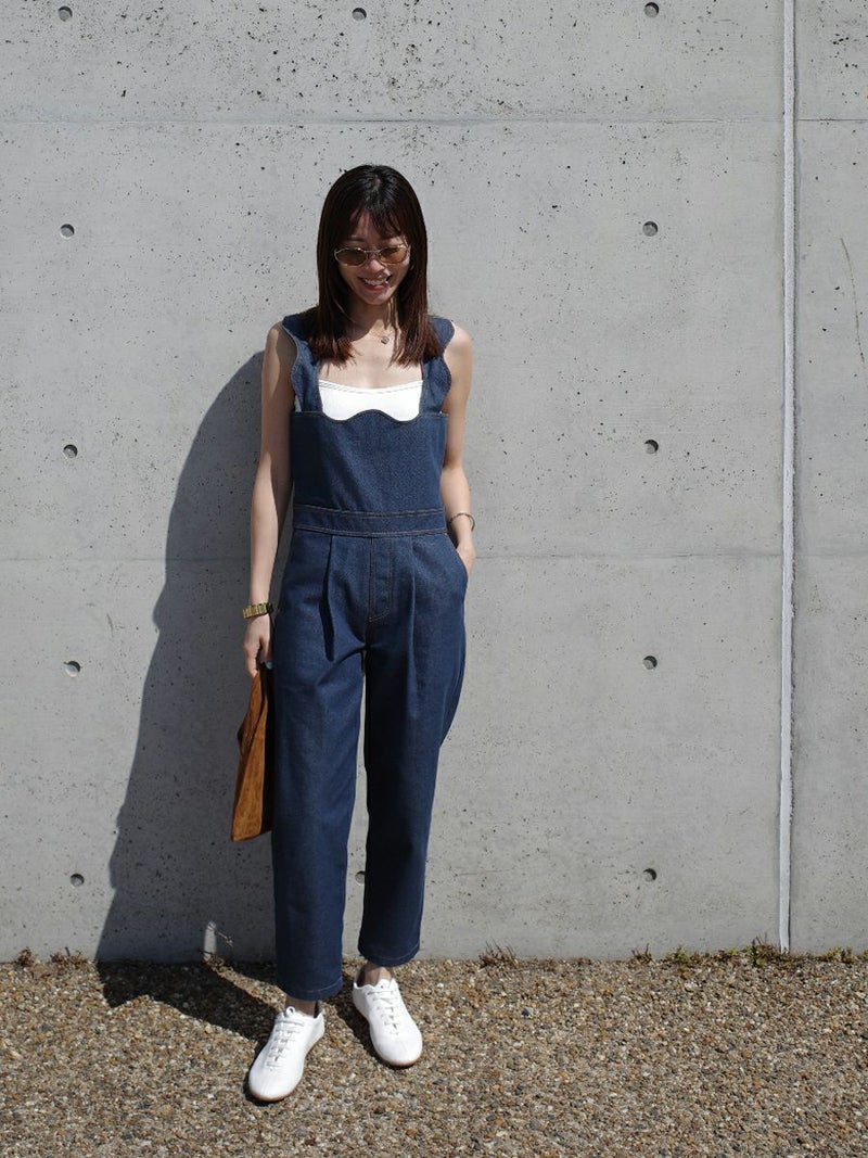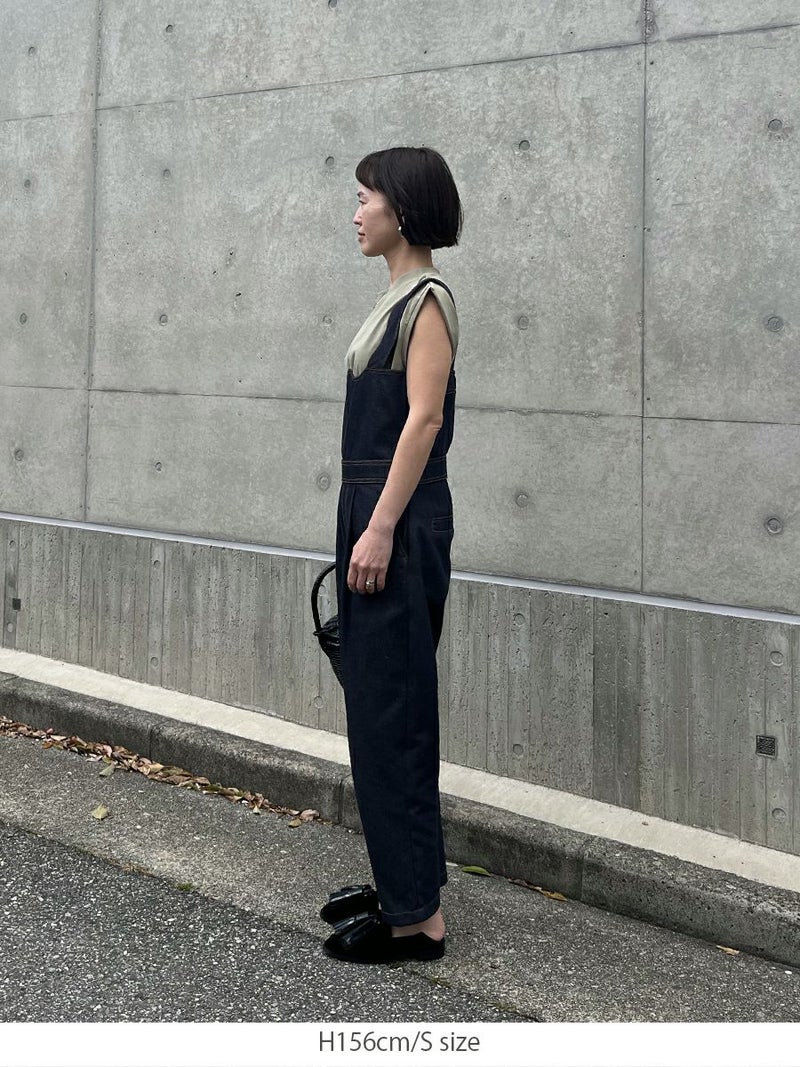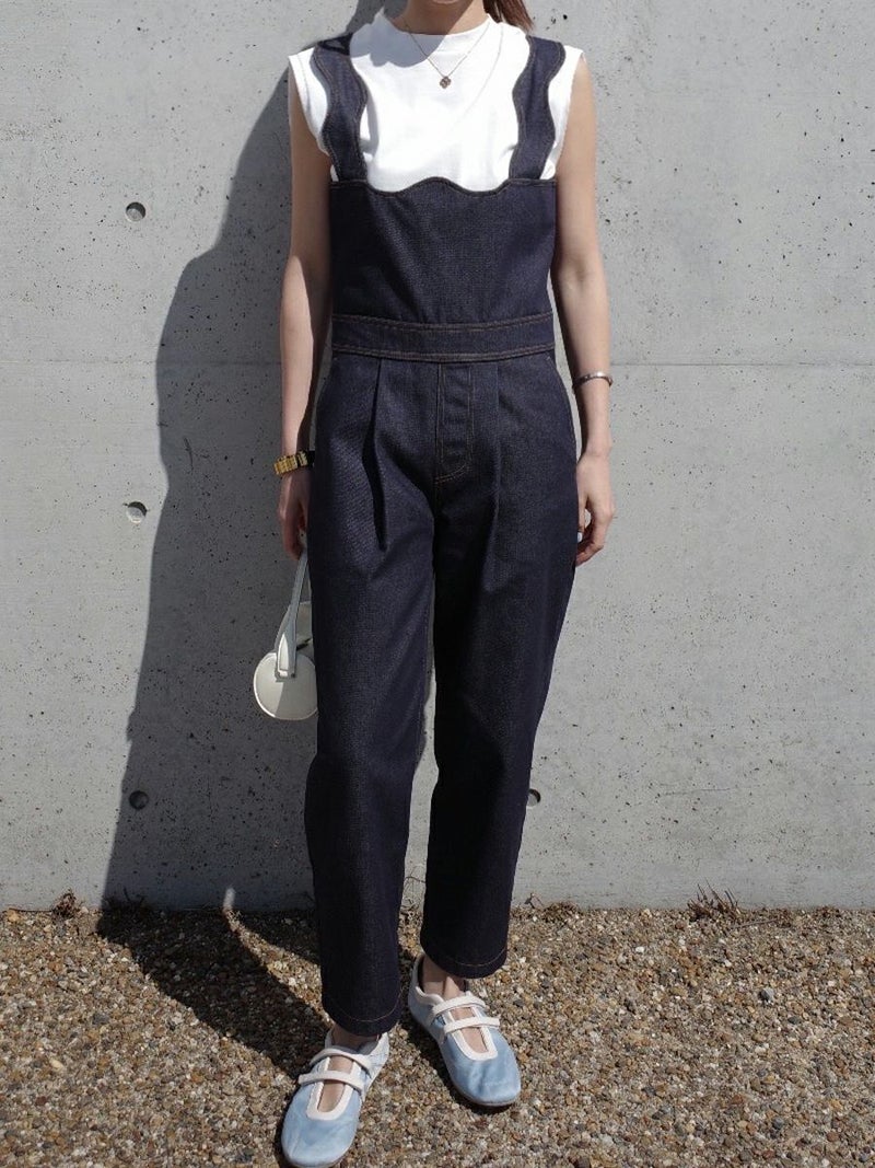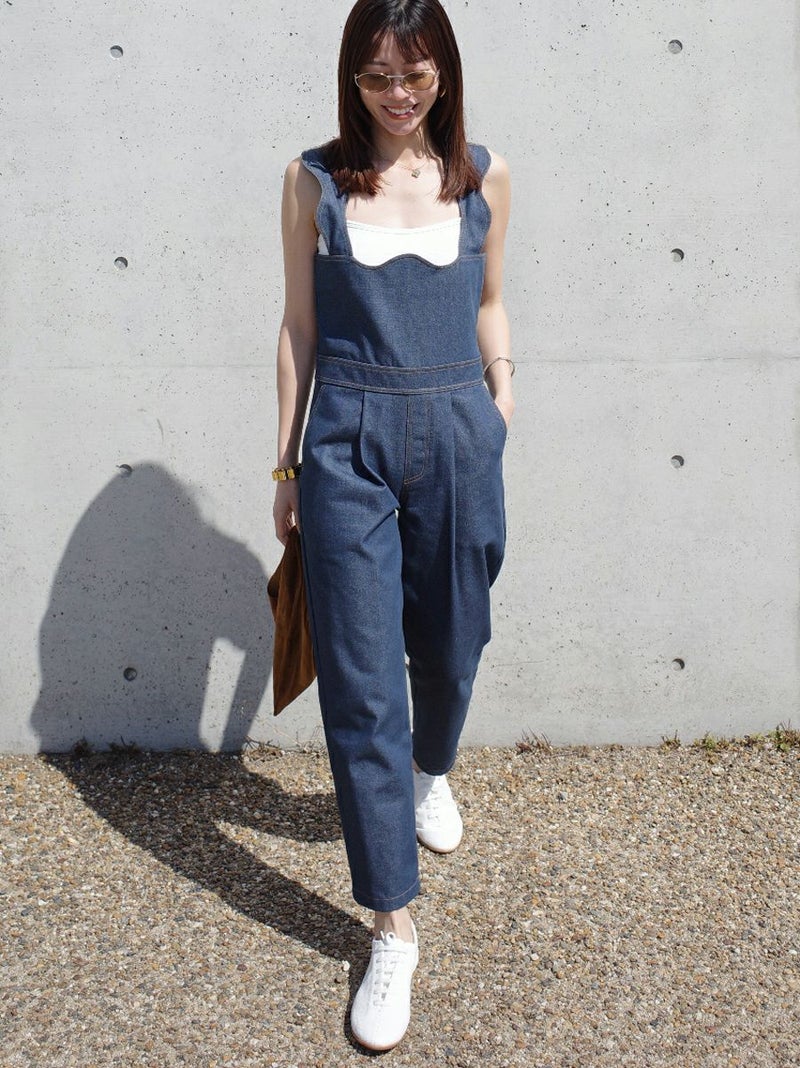 履きやすく色落ちしにくいデニム生地でお作りした女性らしいシルエットを叶えてくれるデニムサロペット。