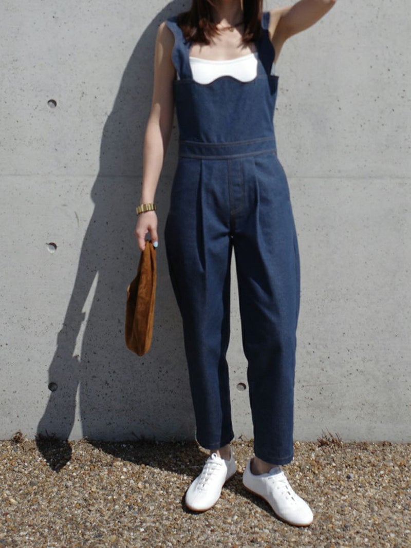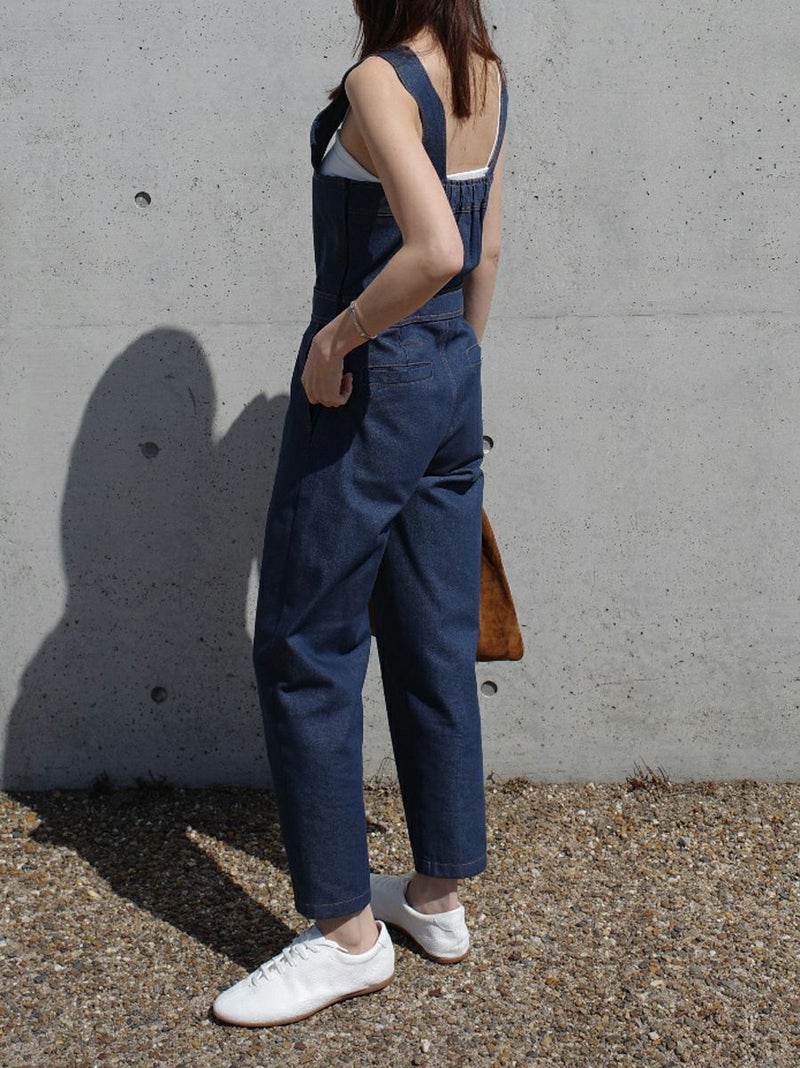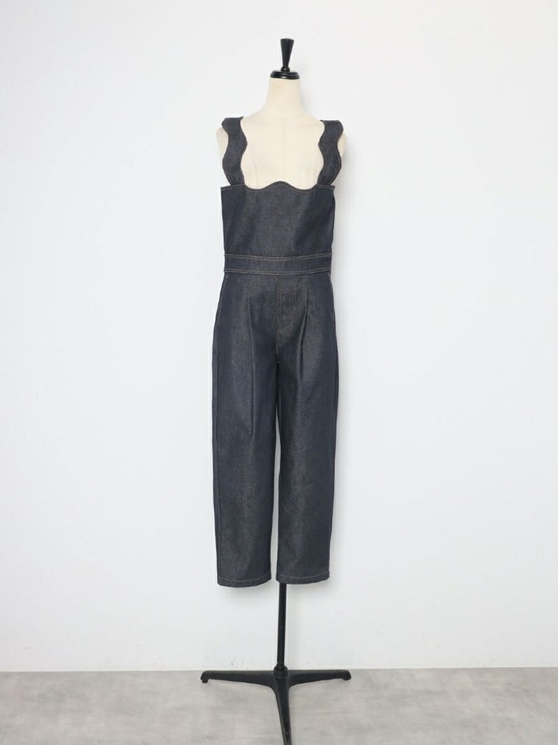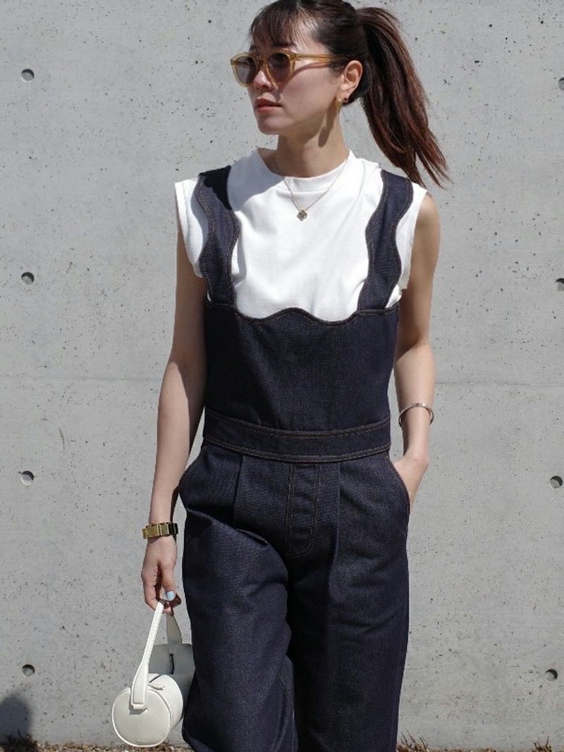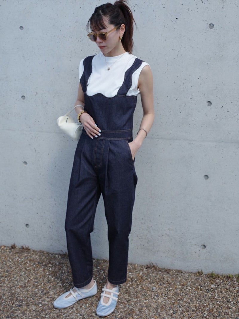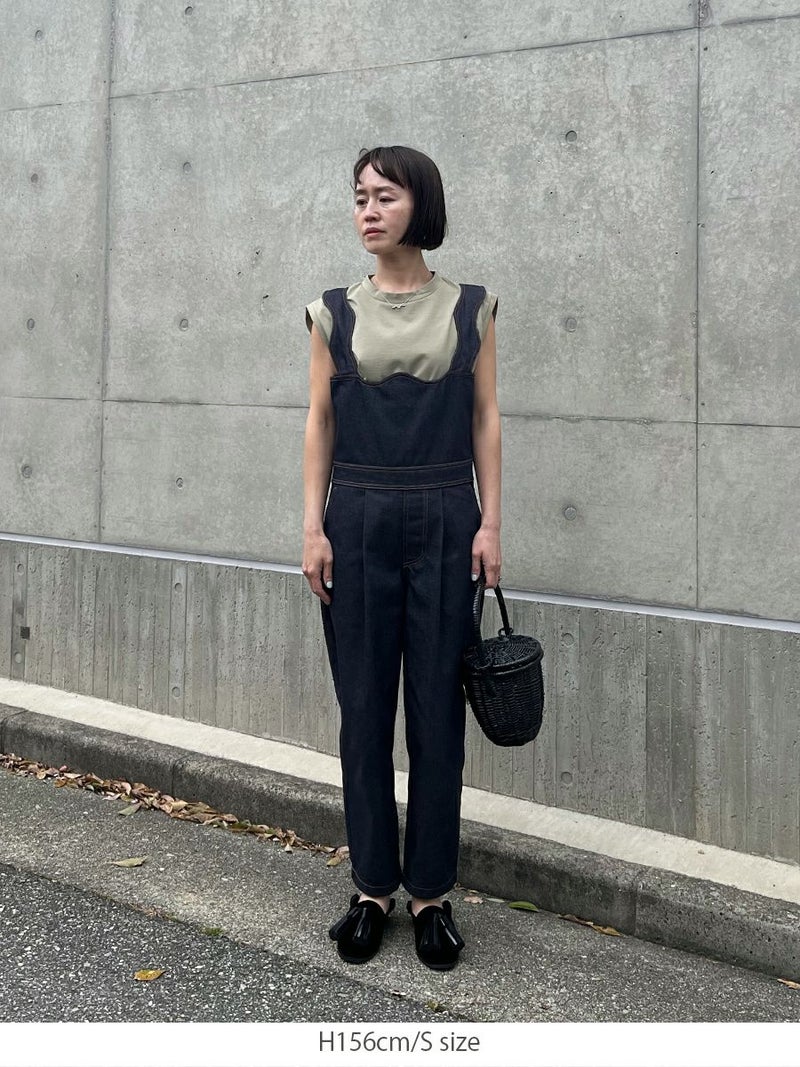 履きやすく色落ちしにくいデニム生地でお作りした女性らしいシルエットを叶えてくれるデニムサロペット。