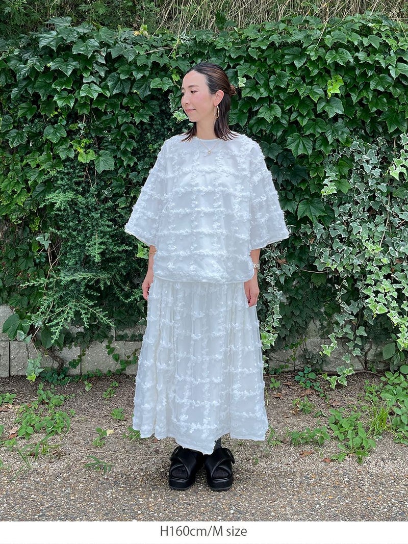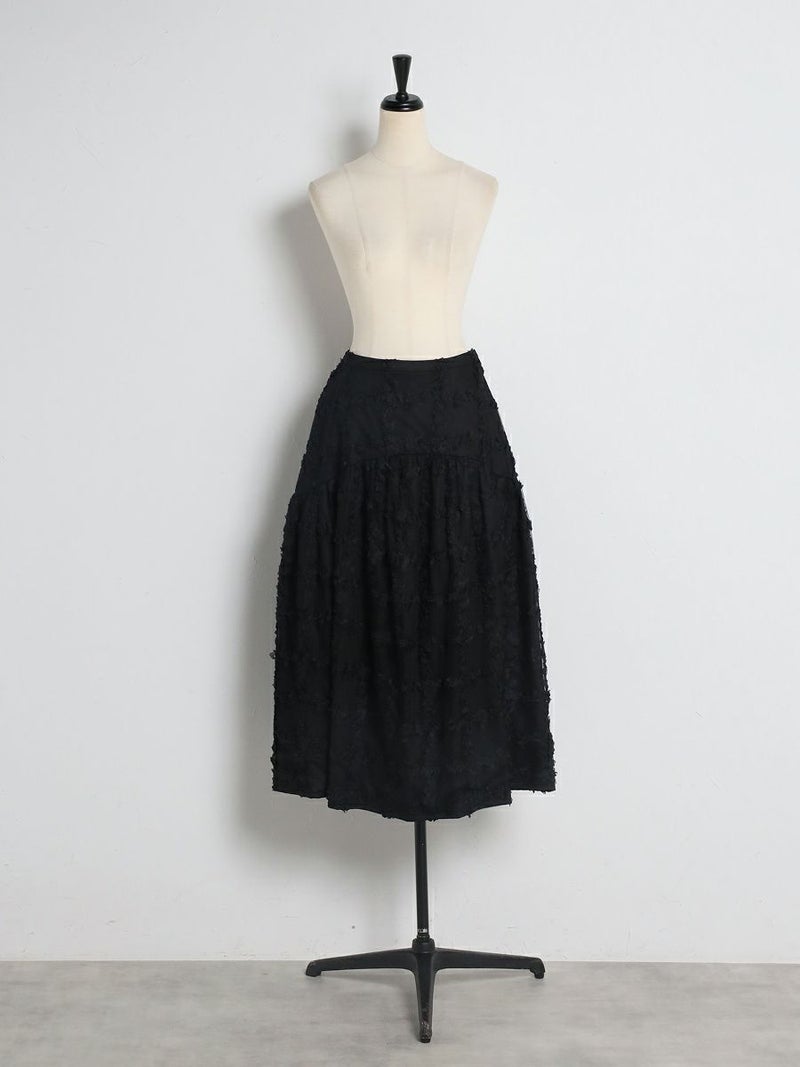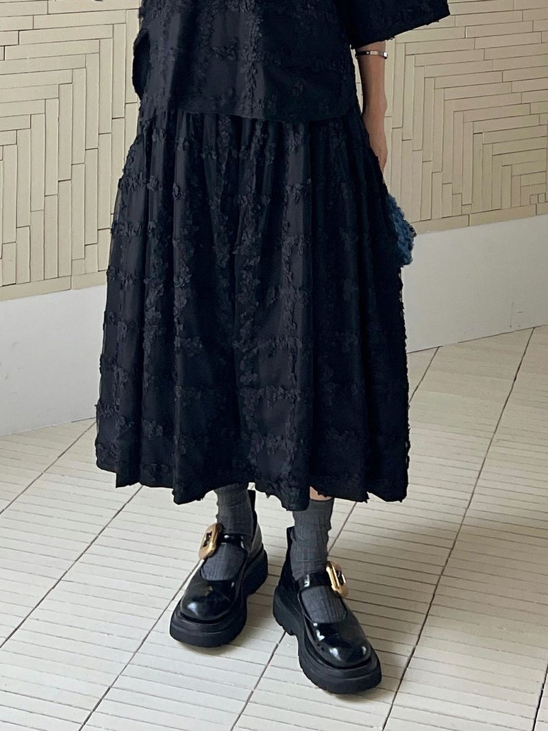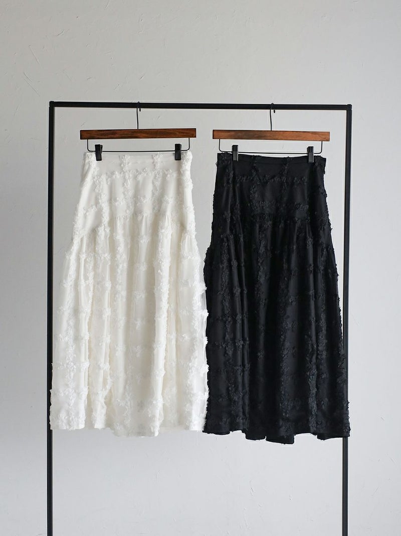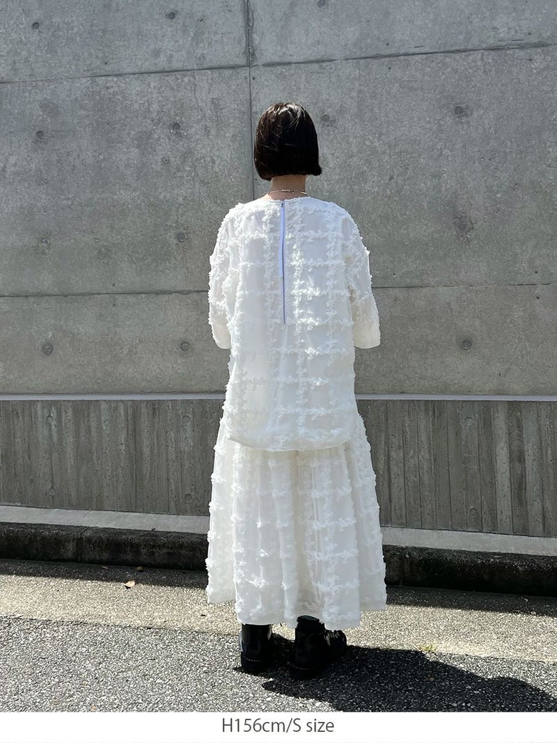 立体的に何層にも花びらが重なり合ったように表現された格子柄が美しく映えるスカート。