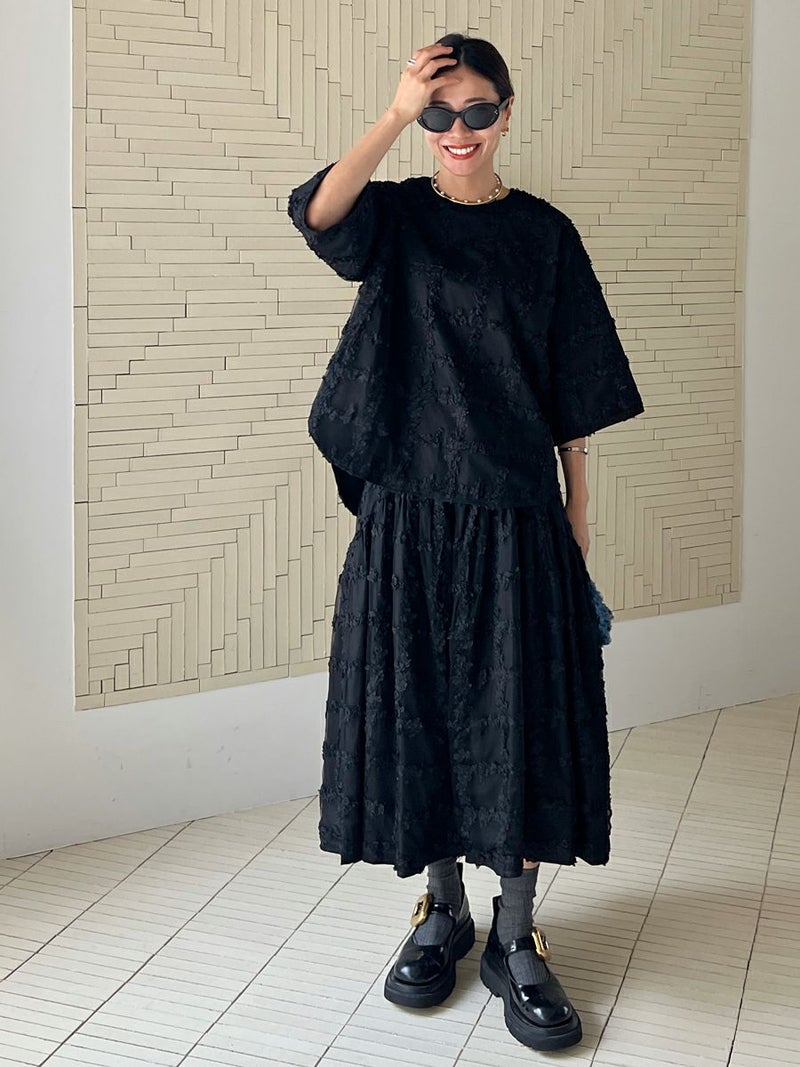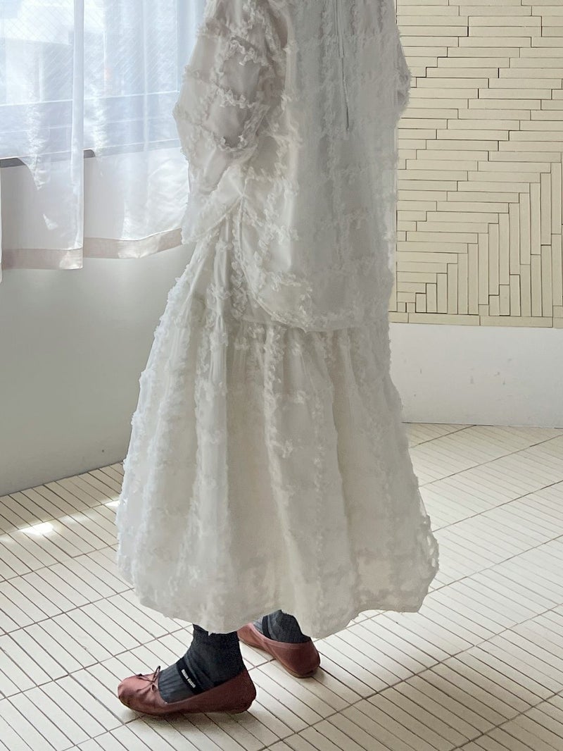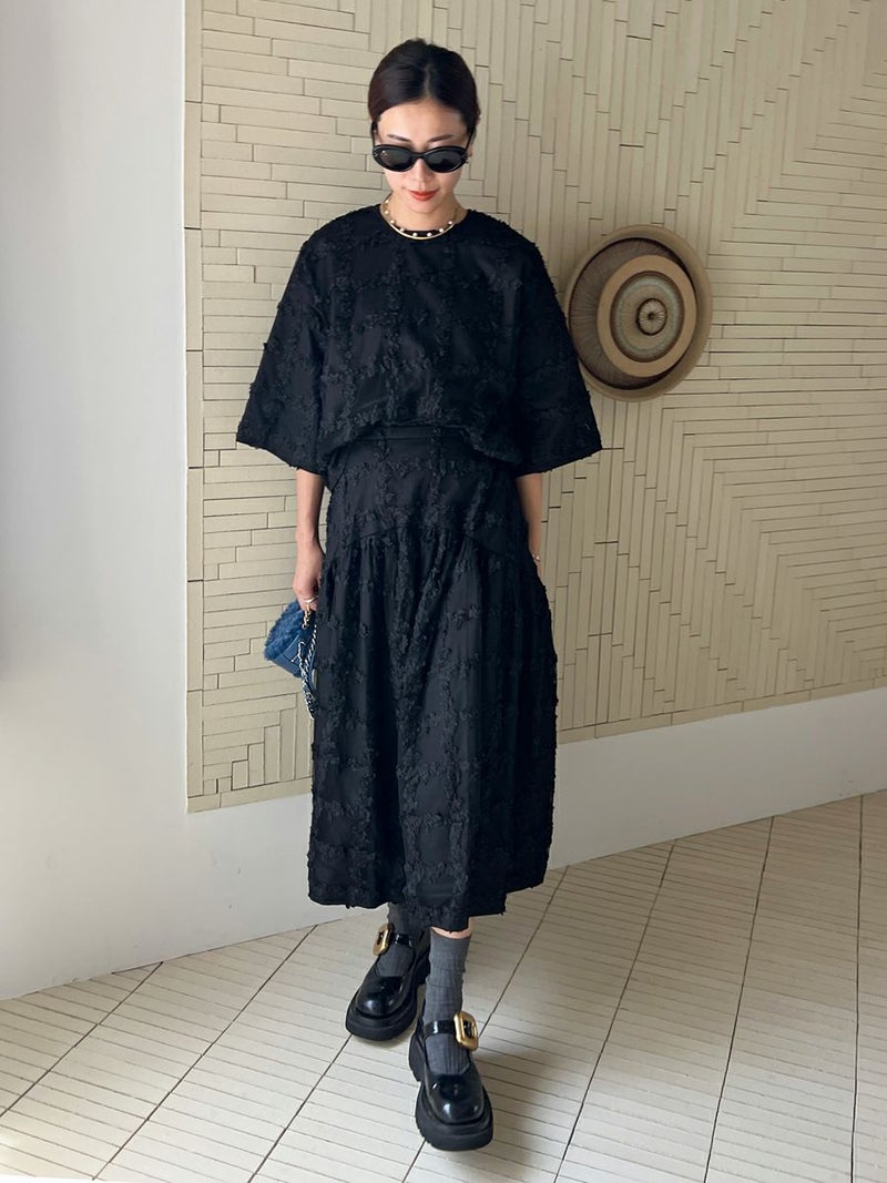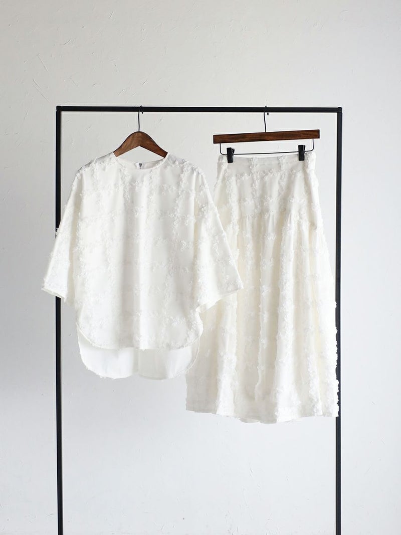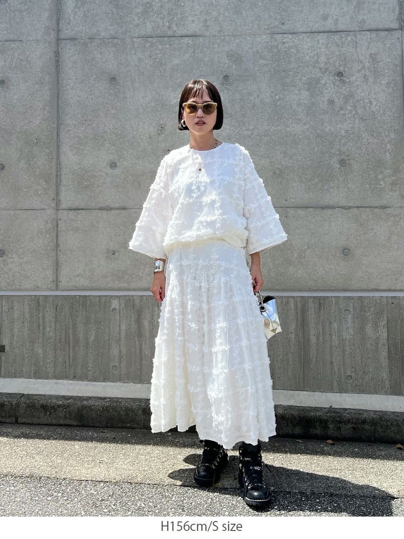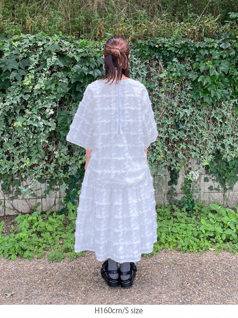 立体的に何層にも花びらが重なり合ったように表現された格子柄が美しく映えるスカート。