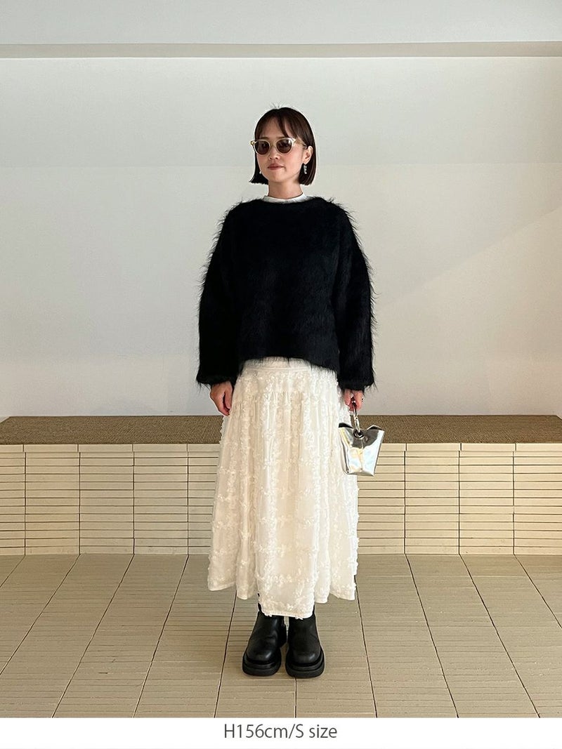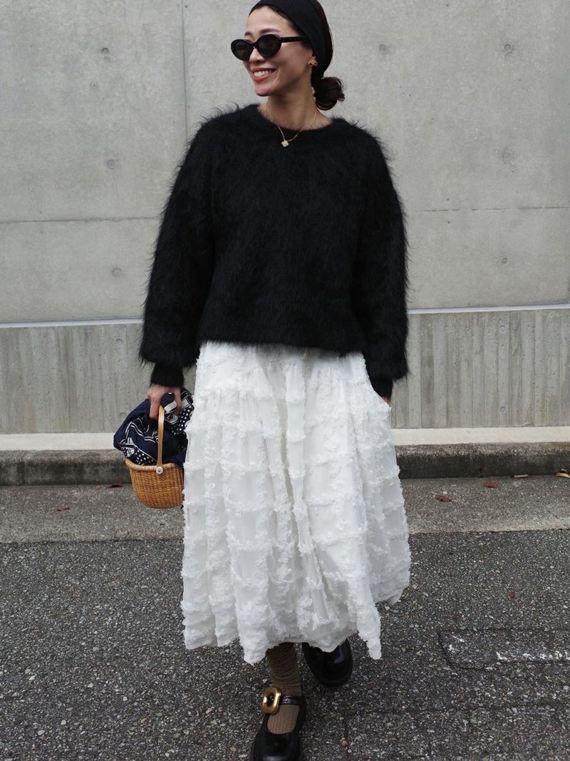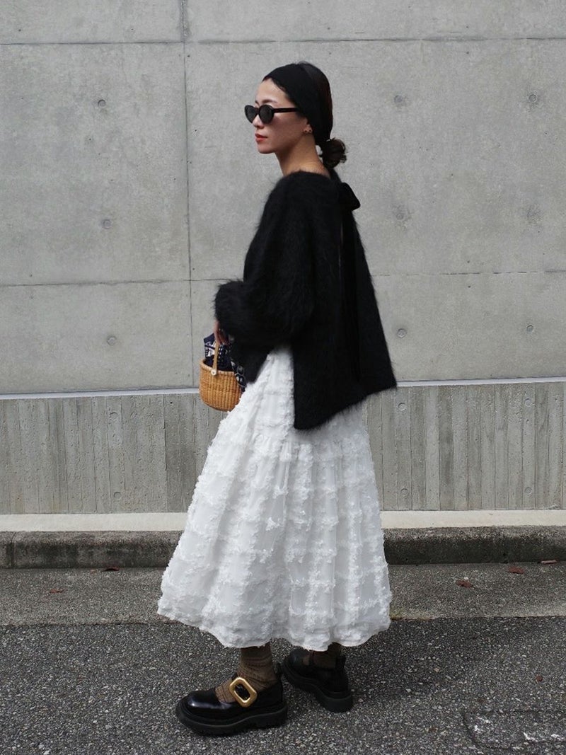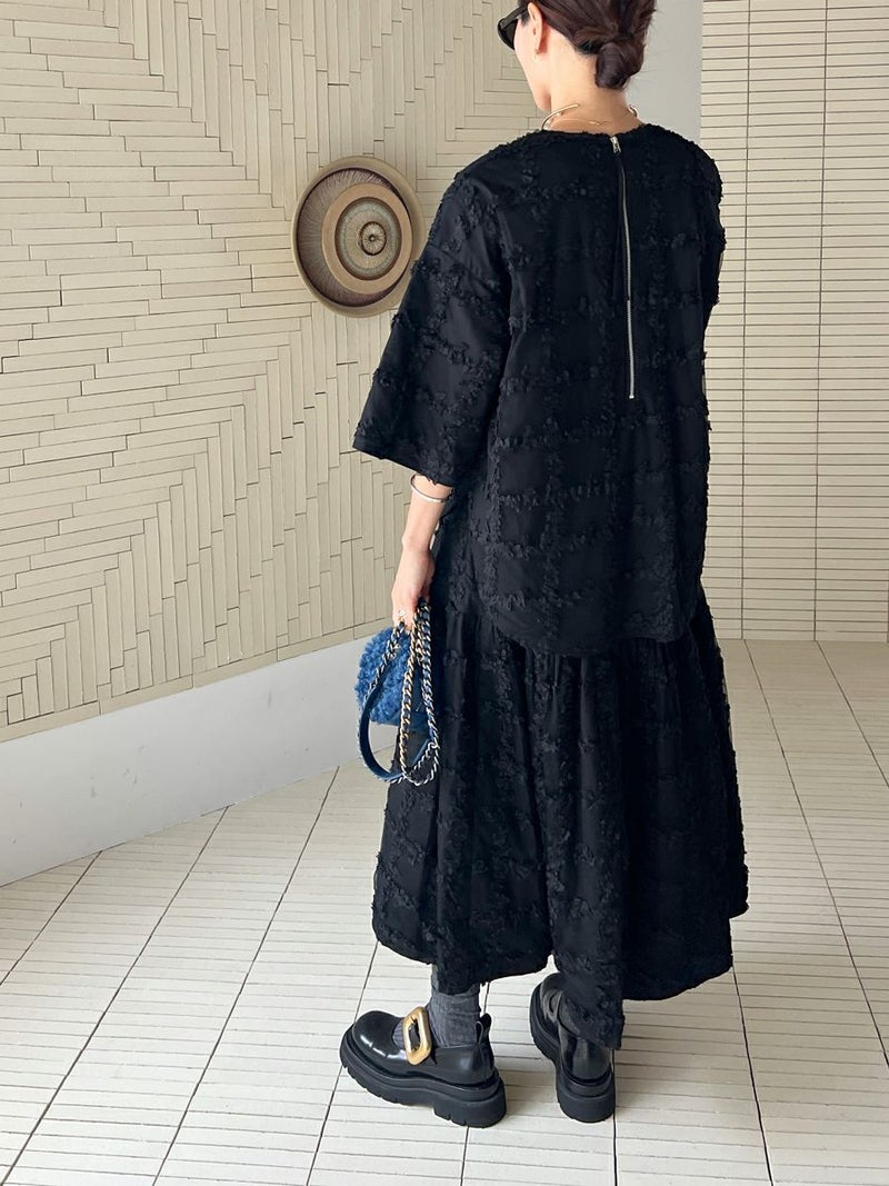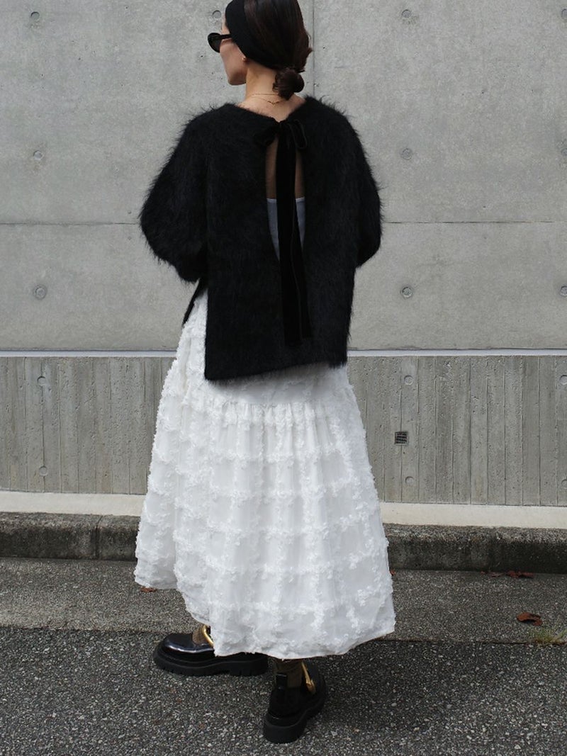 立体的に何層にも花びらが重なり合ったように表現された格子柄が美しく映えるスカート。