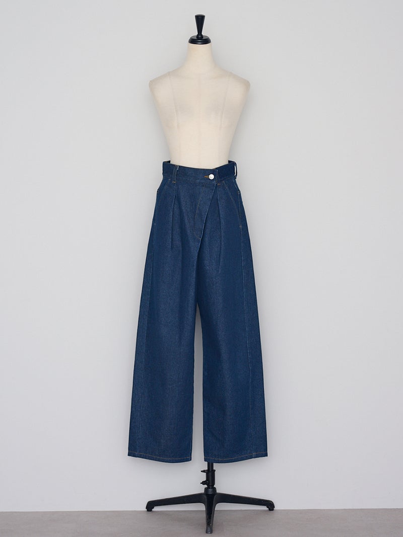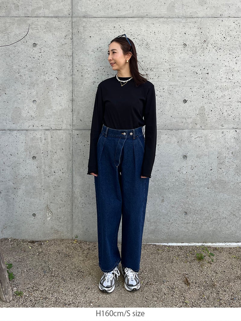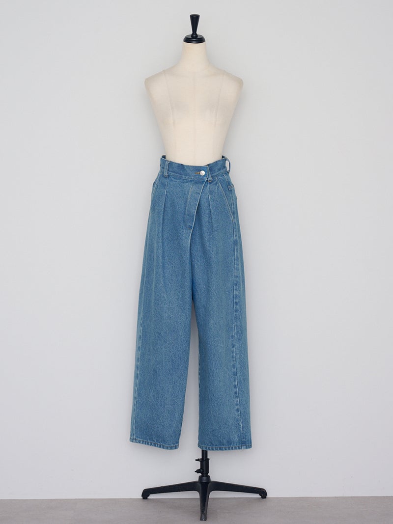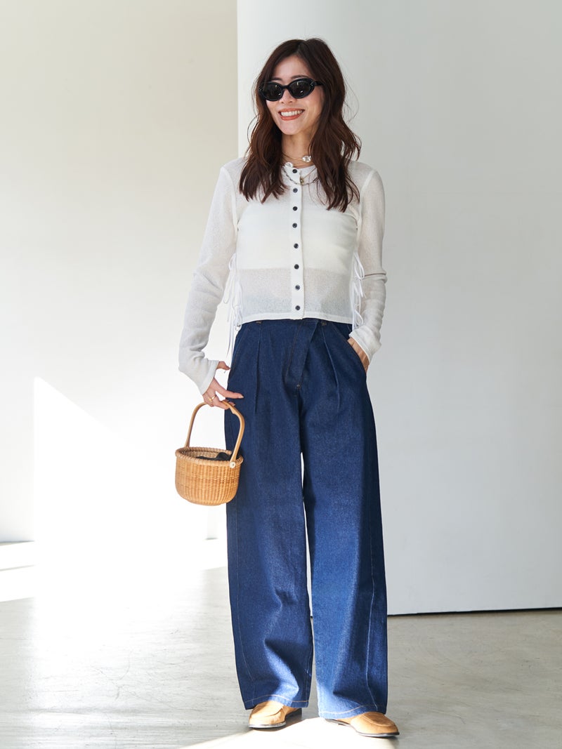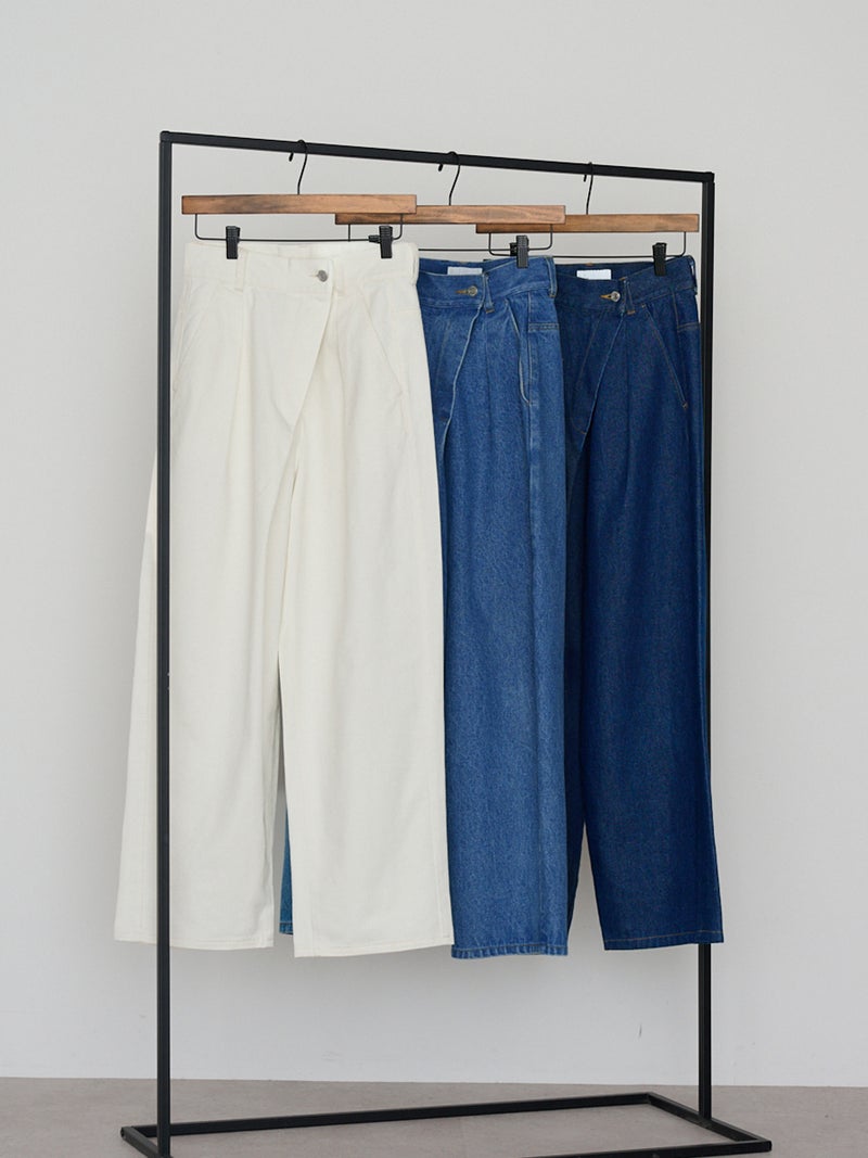 デニムパンツにタックデザインとラップ調のウエストをプラスすることで腰回りのラインをカバーしつつ、シンプルなトップスとのコーディネートも様になるバランスに仕上げました。
