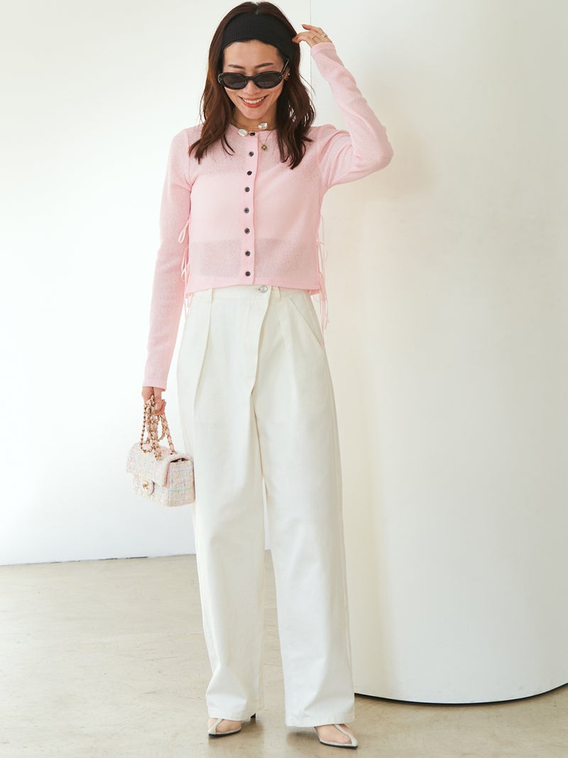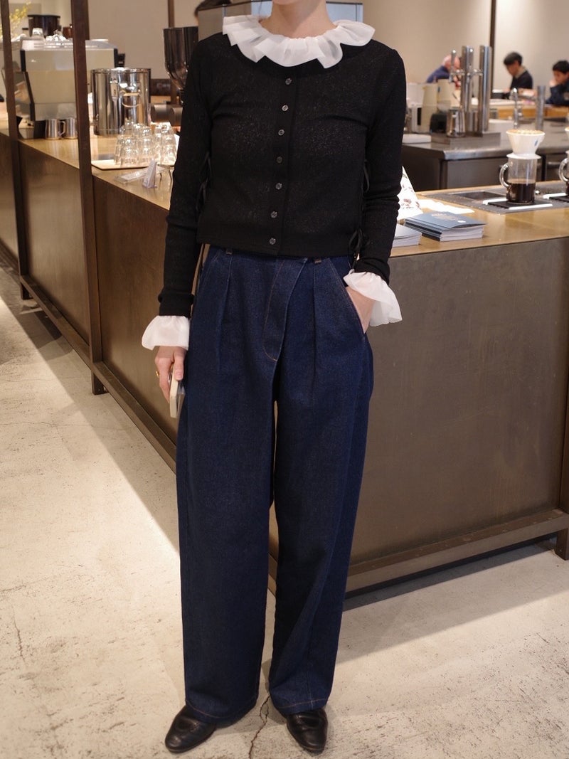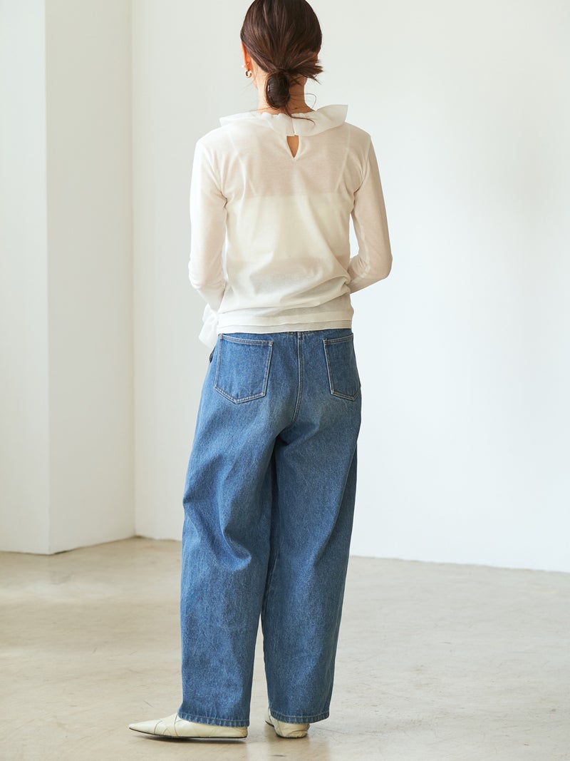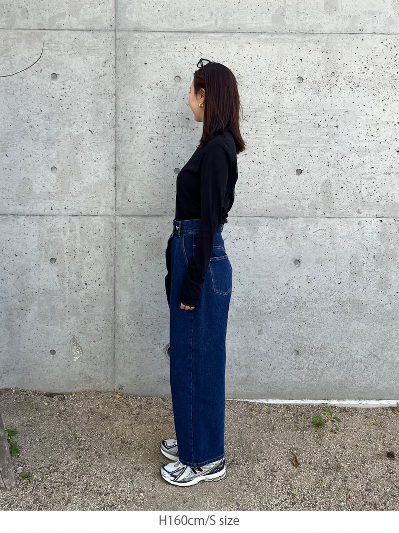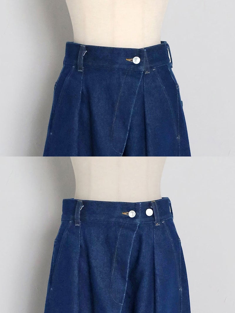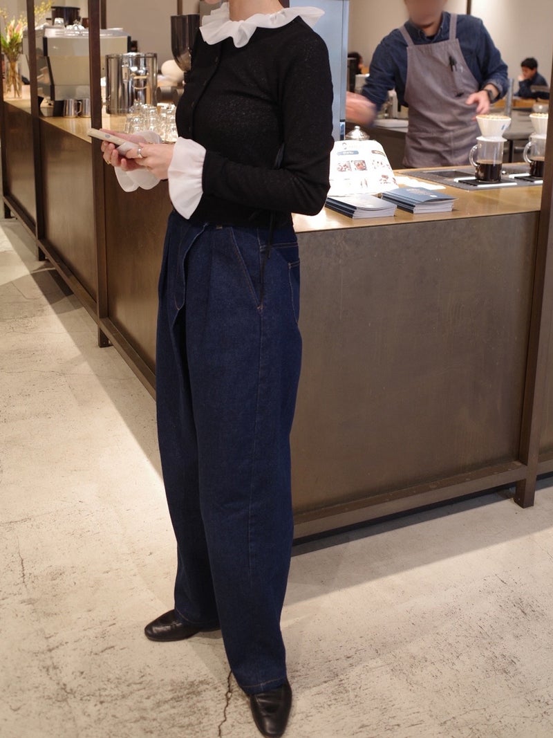 デニムパンツにタックデザインとラップ調のウエストをプラスすることで腰回りのラインをカバーしつつ、シンプルなトップスとのコーディネートも様になるバランスに仕上げました。