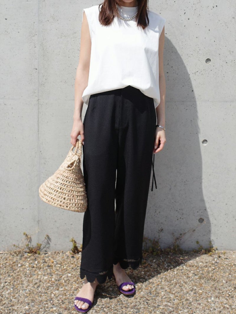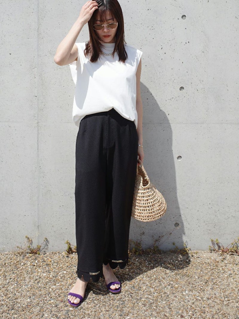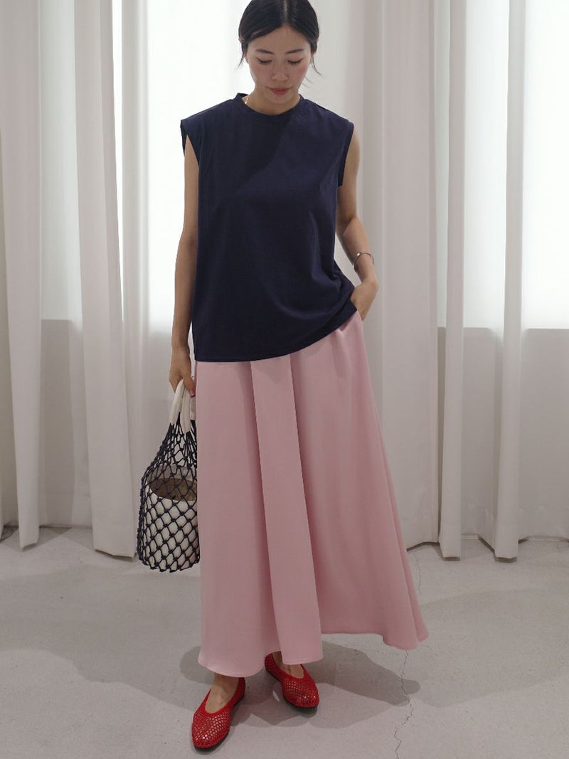 シンプルなデザインは、カラーパンツやスカートとも好相性。