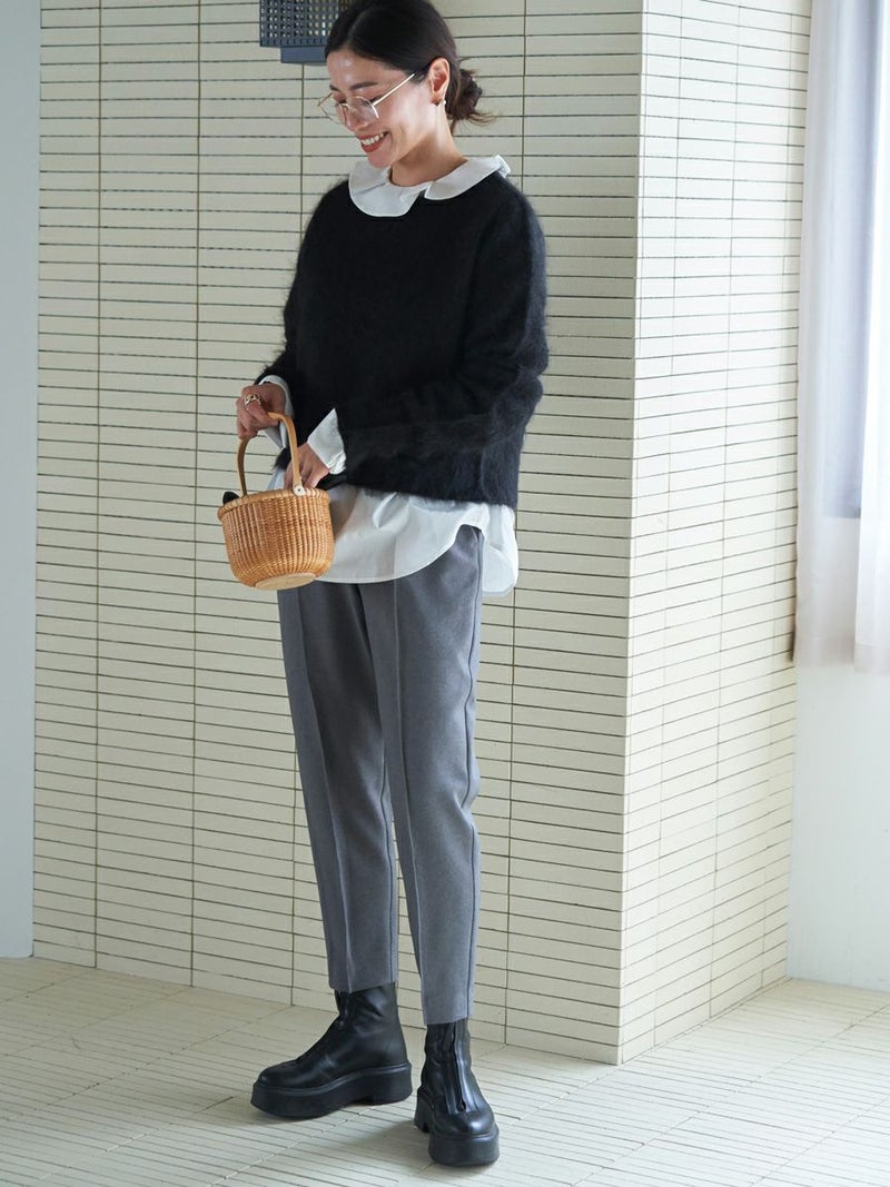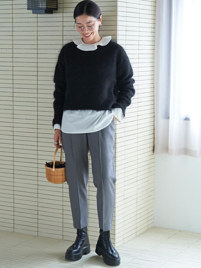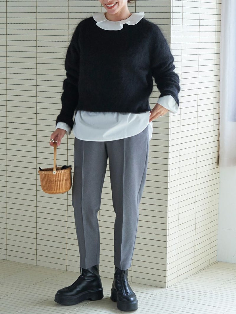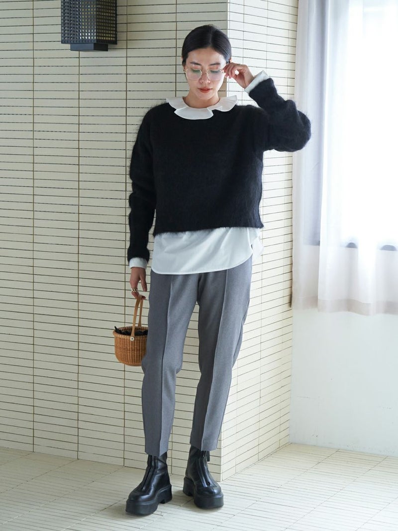 シックなブラックカラーは、オンにもオフにも取り入れやすく、大人のワードローブに重宝する一枚です。