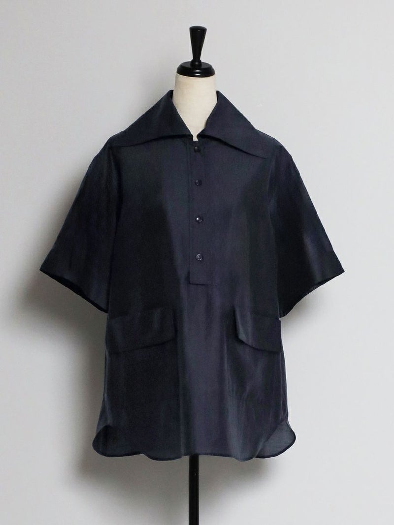 スカーフを巻いたような衿デザインで仕上げたオーバーサイジングのショートスリーブシャツ。