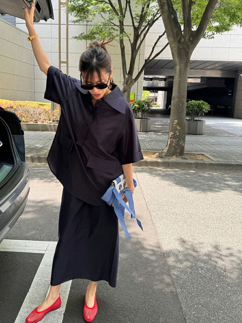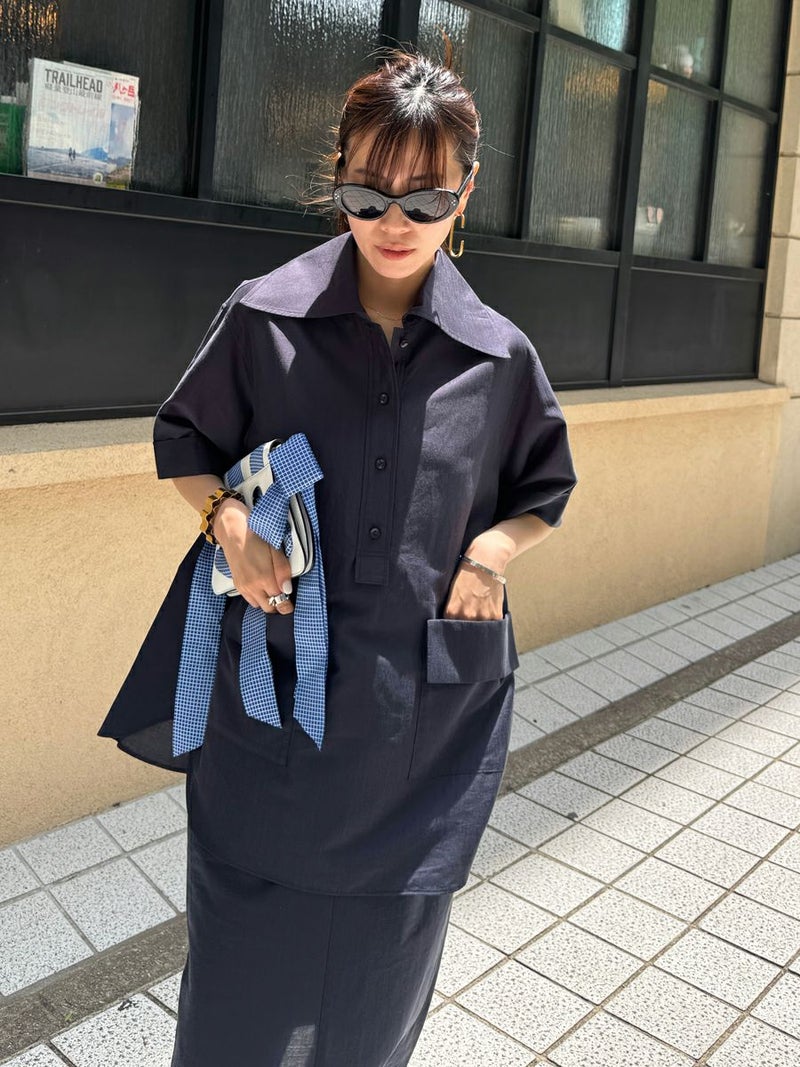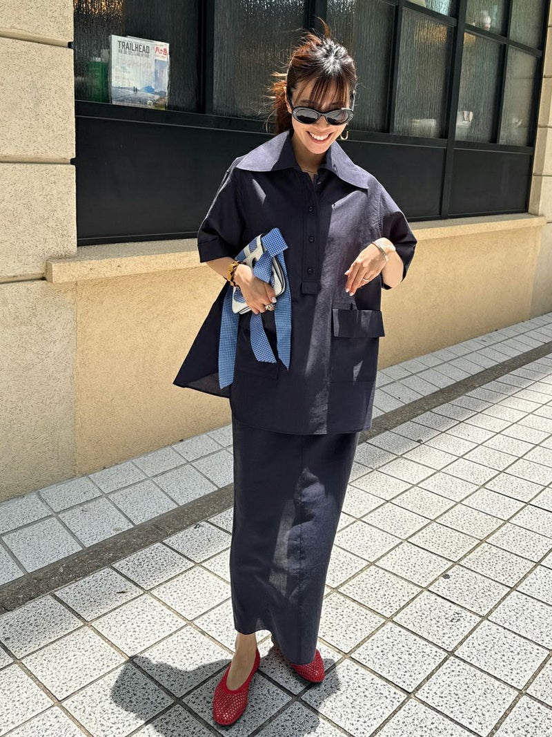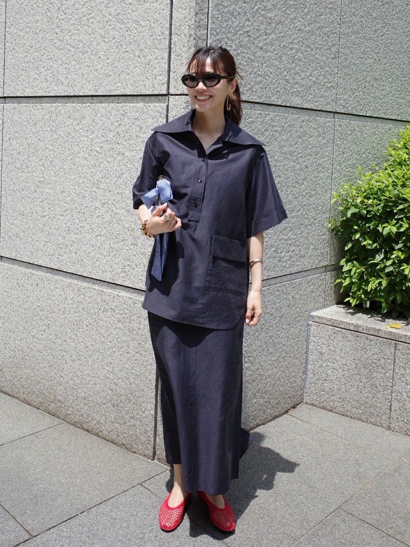 NAVYは同素材のSHEER NARROW SKIRTとのセットアップスタイルもおすすめです。